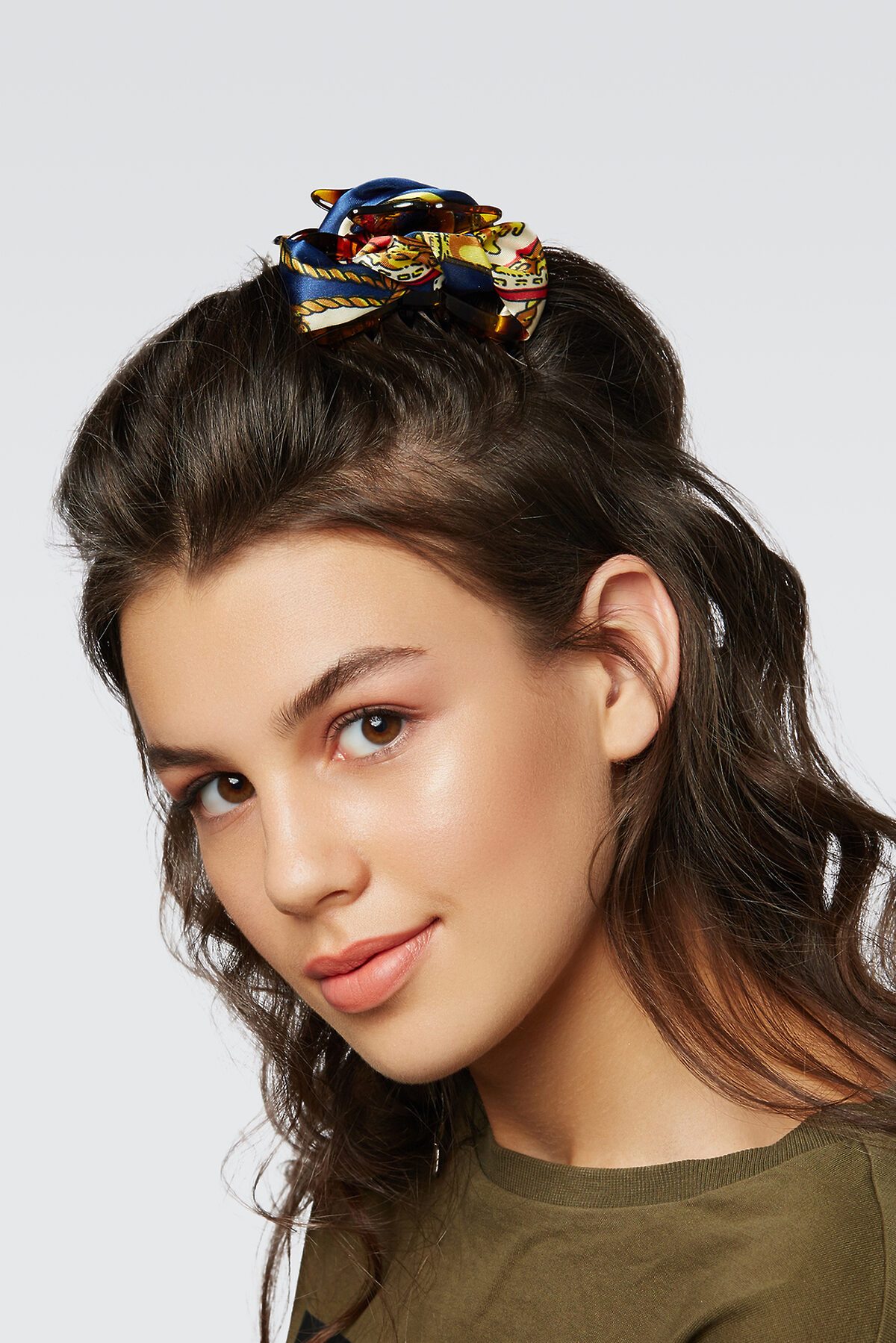 Легкая и практичная заколка-краб декорированная шелковистой лентой. 12 зубчиков с закругленными краями надежно фиксируют пряди волос.