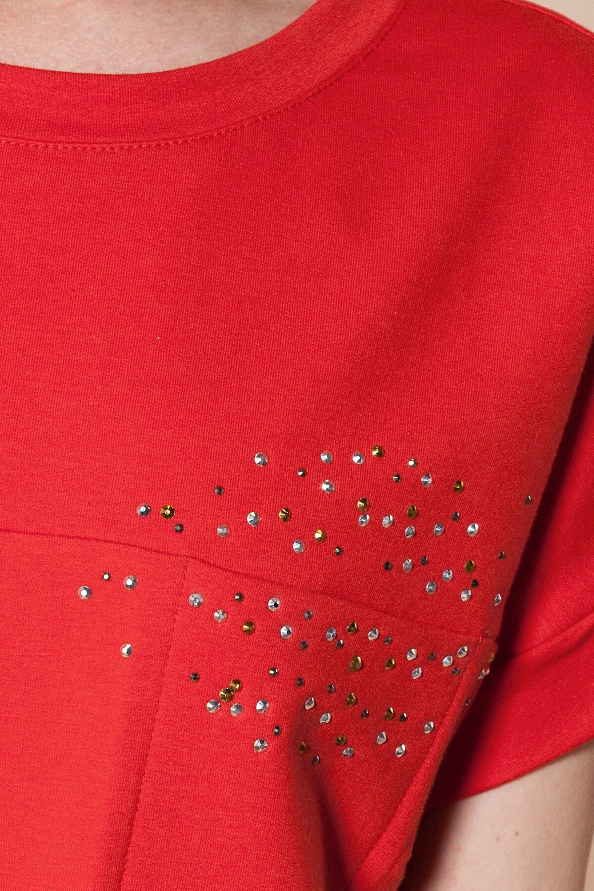 Платье прямого силуэта с отдельным поясом выполнено из тонкого эластичного футера. Кокетка украшена асимметричной россыпью страз нескольких оттенков. Эффектная линия низа вытягивает силуэт.