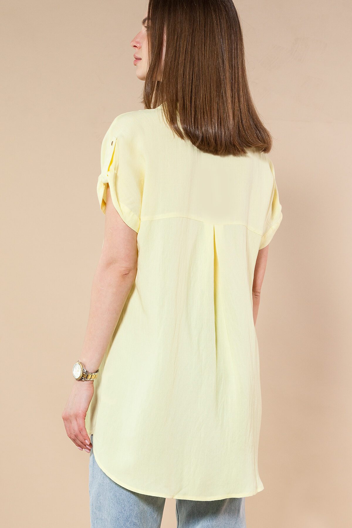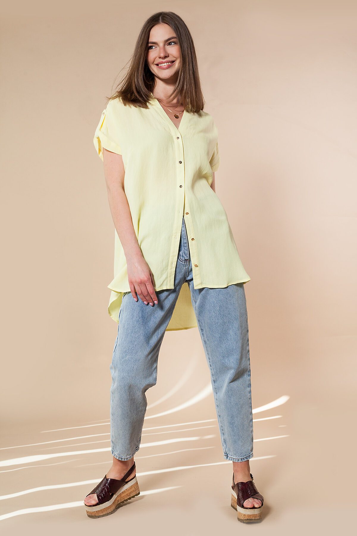 Блузка выполнена из вискозы полотняного плетения с небольшим эффектом жатки, что делает ткань менее мнущейся и формоустойчивой. Цельнокроеный рукав отлично садится на любую фигуру, рукав и плечо регулируются патой. Планка украшена золотистыми пуговицами. Свободное, летящее изделие - отлично подходит как для деловых образов, так и в качестве накидки в многослойных луках.