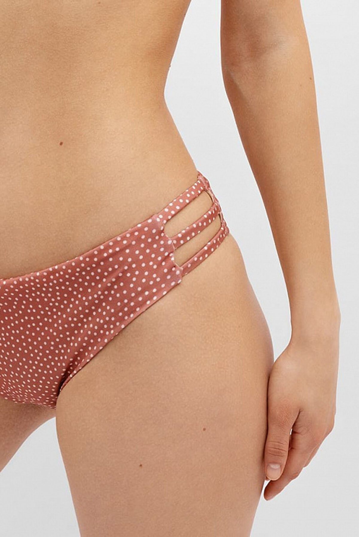 Бюстгальтер купальный с формованными вкладышами, без каркасов. Треугольные мягкие чашки со сборкой. Детали чашек обработаны резиной. Стан с застежкой. По верхнему срезу стана резина. По нижнему срезу стана обтачка с резиной внутри. Бретели с резиной внутри. Трусы купальные «слип» с декоративными протяжками по боковым деталям. Передняя деталь на подкладке (обработана внутренними швами). Задняя деталь на подкладке. Верхний и нижние срезы трусов обработаны резиной.