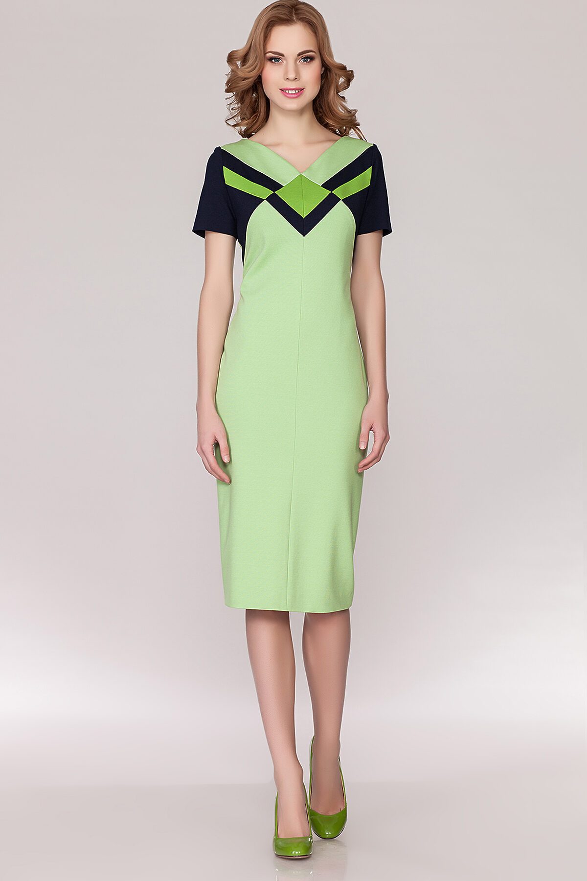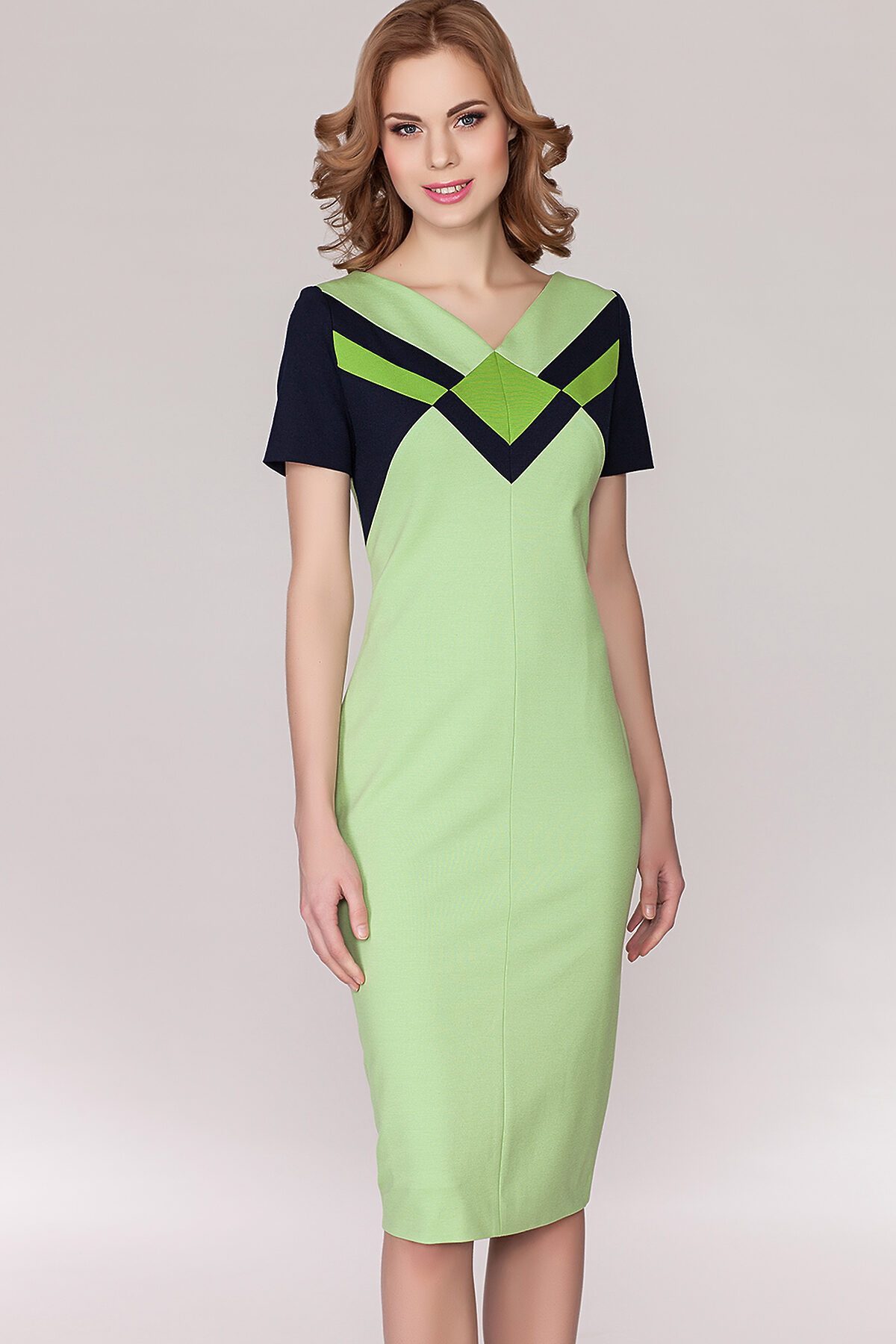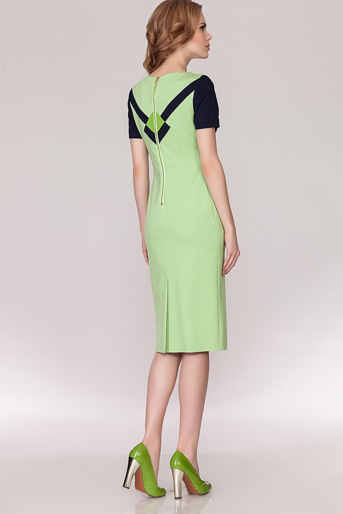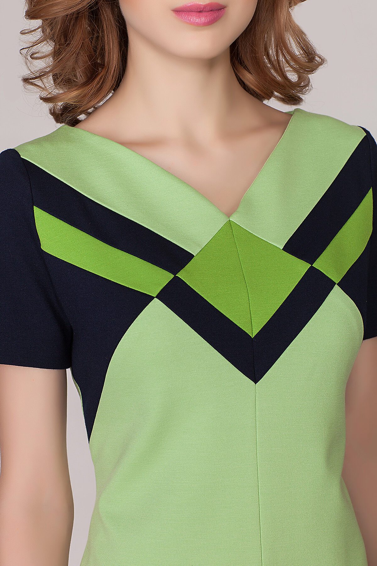 Запоминающееся платье от Вемина, выполненное из плотного трикотажного эластичного джерси в сочетании светло-зеленого, темно-синего и ярко-лаймового цветов. Платье с коротким рукавом, V-образным вырезом, на спине застегивается на металлическую молнию и имеет шлицу на подоле.