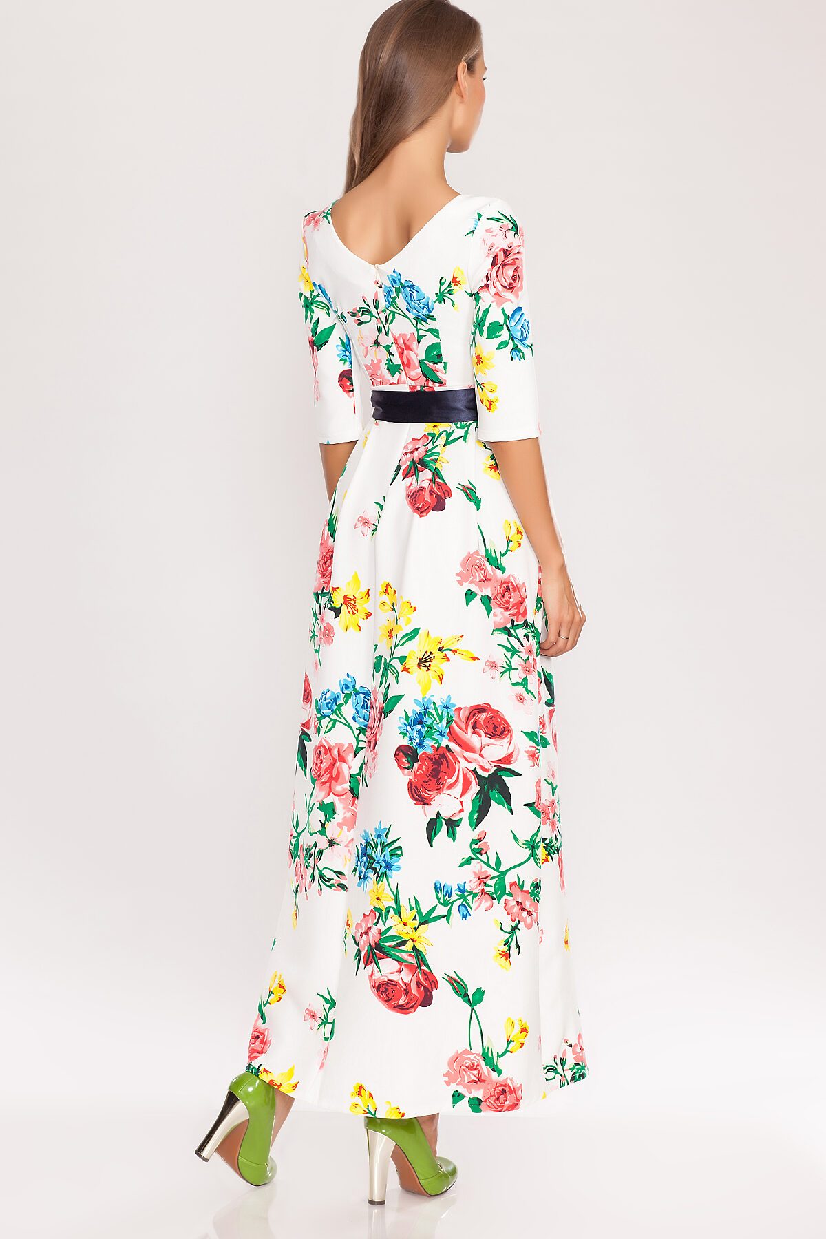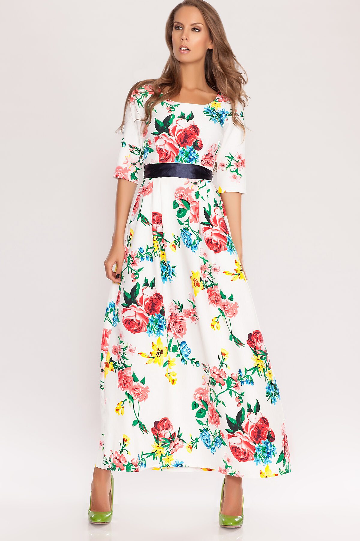 Невероятное летнее платье в пол, выполненное из плотного эластичного вискозного материала с цветочным рисунком на белом фоне. Платье с круглым вырезом горловины спереди и V-образным сзади. Рукав укорочен, линия талии подчеркнута втачным поясом и текстильным пояском в комплекте. На спине застегивается на потайную молнию, по бокам спереди удобные карманы.