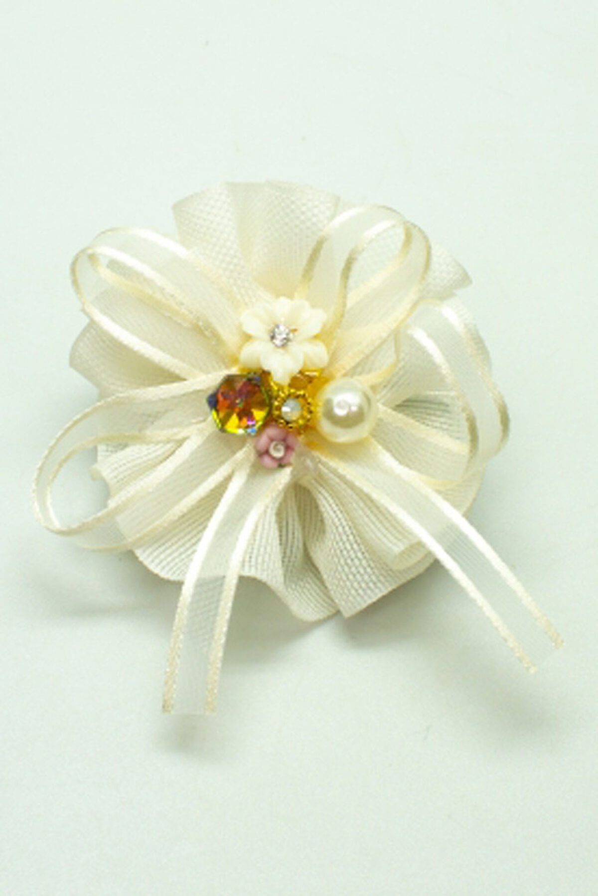 Восхитительная заколка-зажим для девочек, в центре украшена бусинкой, стразами и цветочками. Диаметр 5 см. Цена указана за 6 шт.