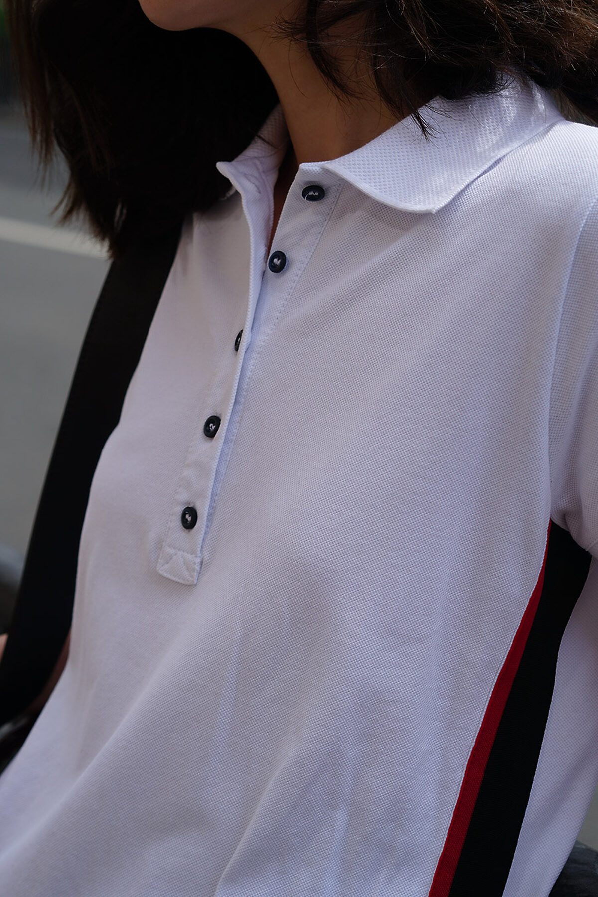 Платье-поло из классической ткани "пике" с дизайнерским плетением ворота и манжетов. Трендовая асимметрия достигнута за счет наличия яркого лампаса с одной стороны. Лампас двуцветный, внизу этой боковой линии разрез. В поддержку лампаса пуговицы т.синего цвета. Свобода облегания и длина изделия также актуальны в текущем сезоне.