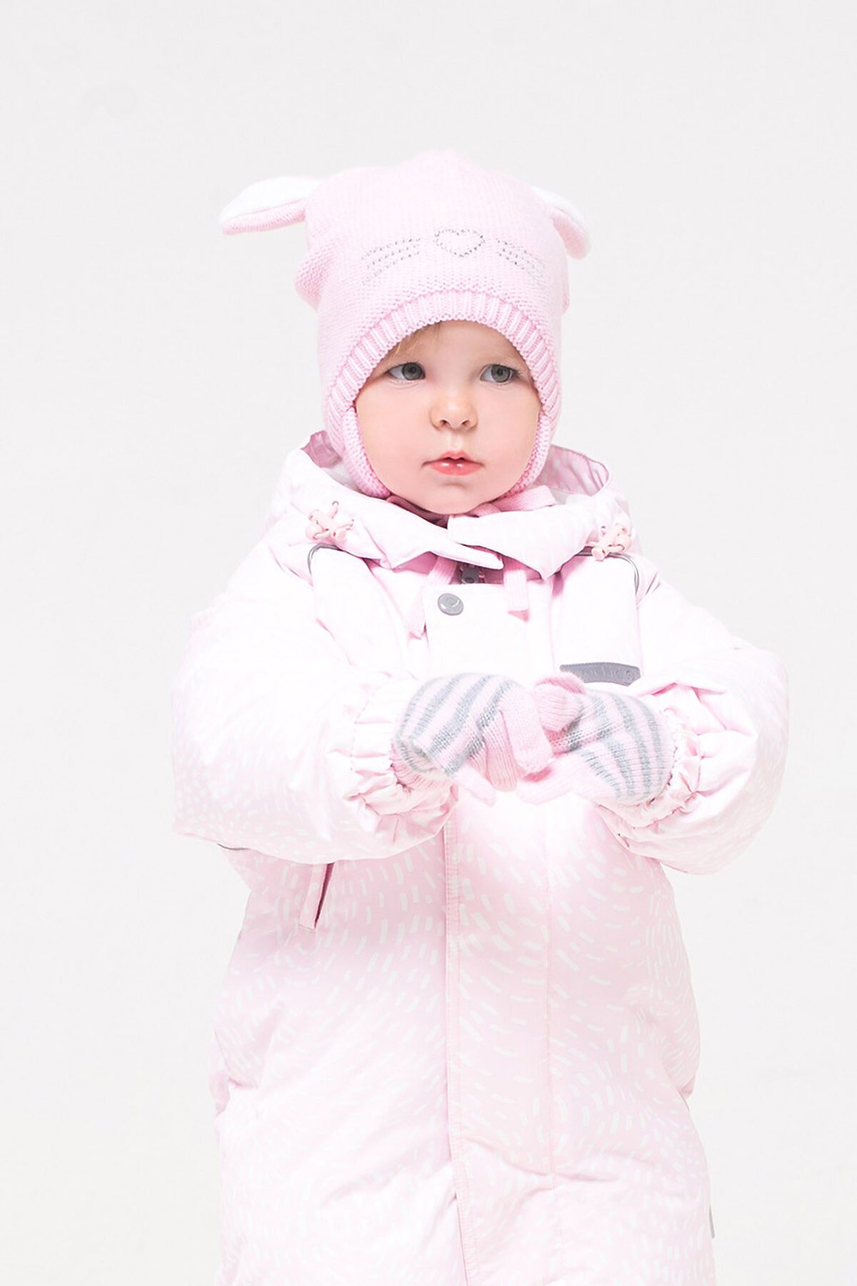 Шапка для девочки из однотонной полушерстяной пряжи, вязка изнаночной гладью. Подкладка из хлопкового трикотажа интерлок. На макушке вытачки, декоративные заячьи ушки, спереди рисунок из страз, по низу уши с завязками.