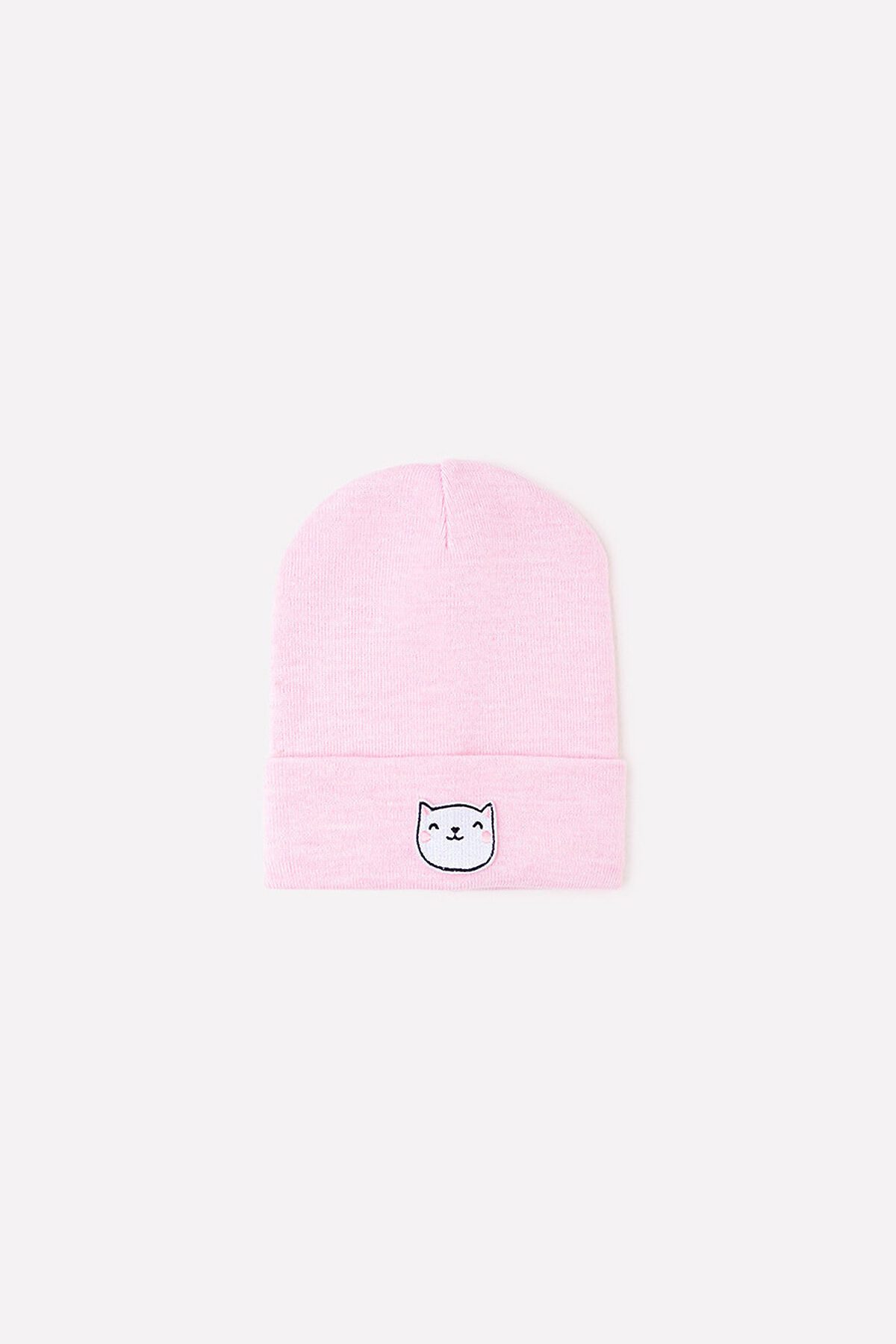 Однотонная шапка для девочки из полушерстяной пряжи. Эластичная вязка. По низу отворот с нашивкой.