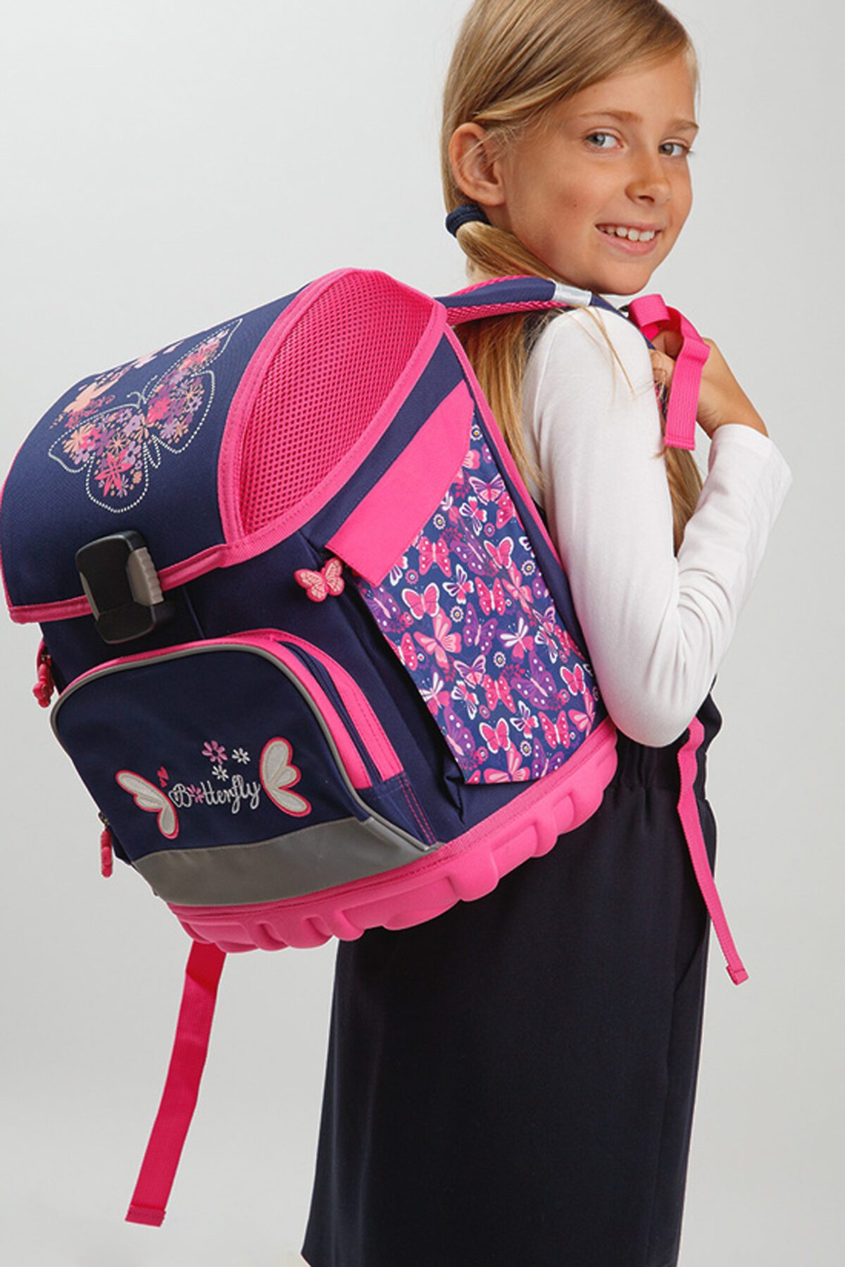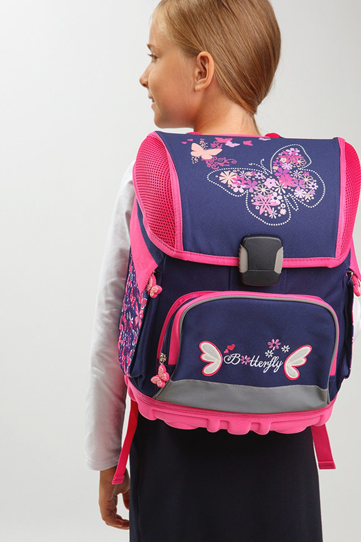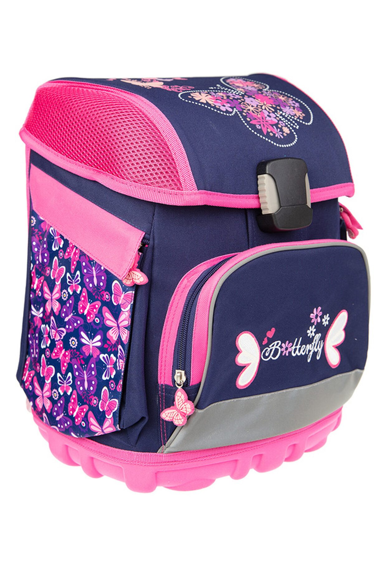 Современный формованный ранец с ортопедической вентилируемой спинкой, распределяющей равномерно нагрузку на спину ребенка; широкие прочные лямки не врезаются в плечи; регулируемые лямки подстраиваются под рост и одежду ребенка; ранец отлично держит форму, не деформируется при складывании в него школьных принадлежностей; устойчивое дно с пластиковой накладкой; влагозащитная пропитка; размеры 29х17х41 см; облегченная конструкция; светоотражающие элементы на лямках; основное отделение с застежкой на карабине, два боковых кармана на молнии; внешний карман на молнии; в основном отделении большой внутренний карман с уплотненной стенкой. В комплект можно подобрать мешок для обуви и пенал.