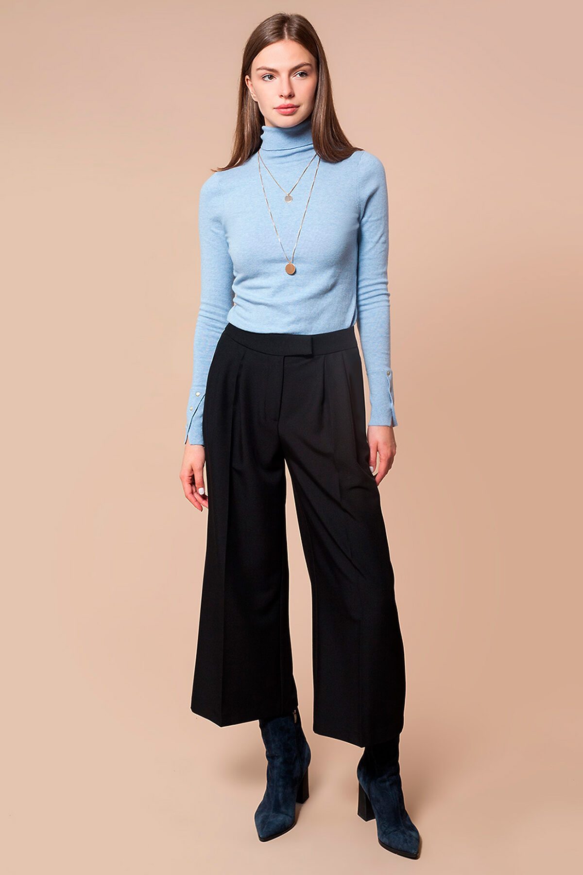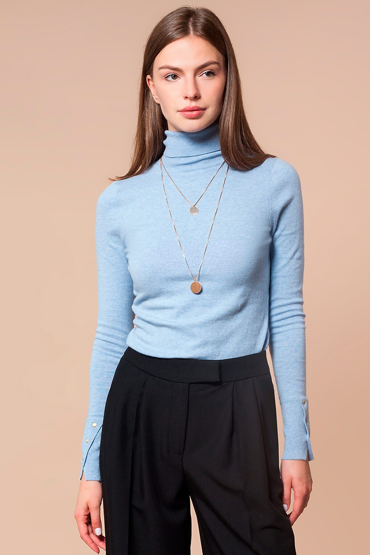 На первый взгляд базовая водолазка. Но фишкой модели являются эффектные манжеты с разрезом, украшенные золотистыми заклепками. Выполнено их хлопка с нейлоном. Натуральный состав гарантирует безупречный комфорт при любой погоде, а нейлон обеспечивает формоустойчивость изделия и стойкость цвета.