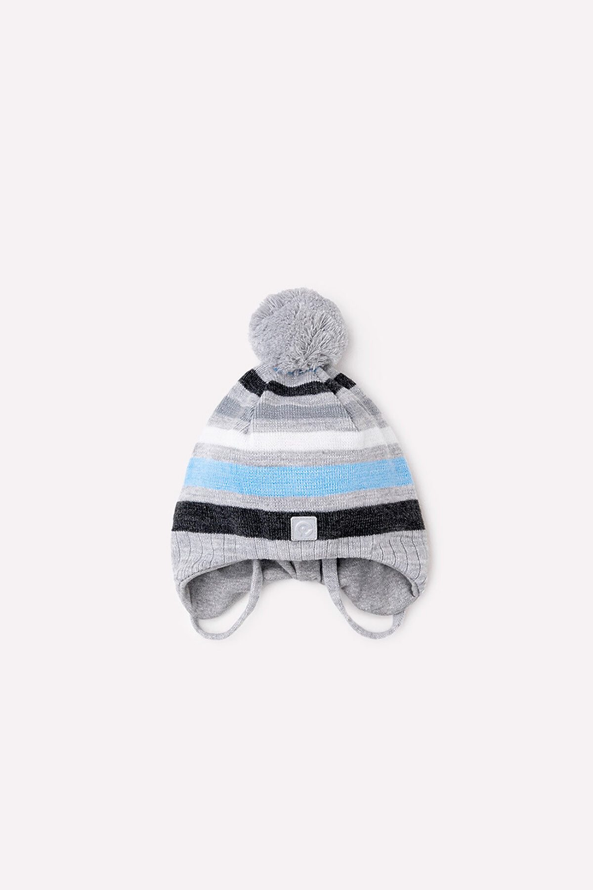 Шапка из полушерстяной пряжи, в полоску. Подкладка из хлопкового трикотажа интерлок. На макушке помпон. По низу цельнокроеные уши с завязками. Спереди светоотражающая нашивка.