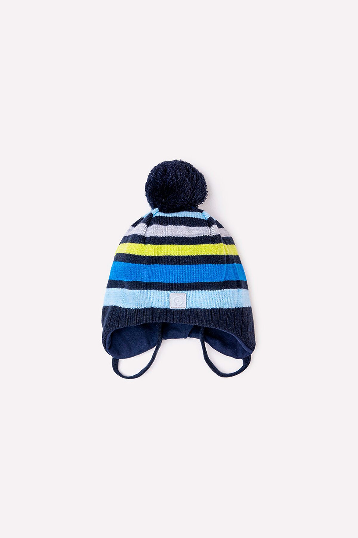Шапка из полушерстяной пряжи, в полоску. Подкладка из хлопкового трикотажа интерлок. На макушке помпон. По низу цельнокроеные уши с завязками. Спереди светоотражающая нашивка.