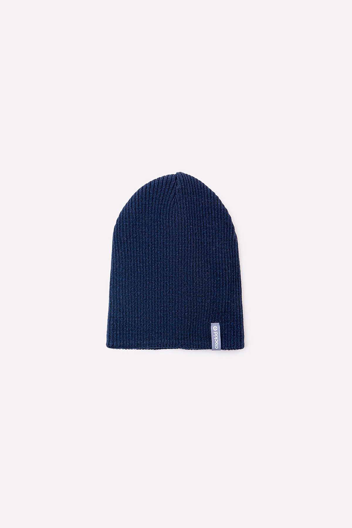 Шапка двухслойная из однотонной полушерстяной пряжи. Эластичная вязка. Скругленная макушка с вытачками. По нижнему краю жаккардовая нашивка.