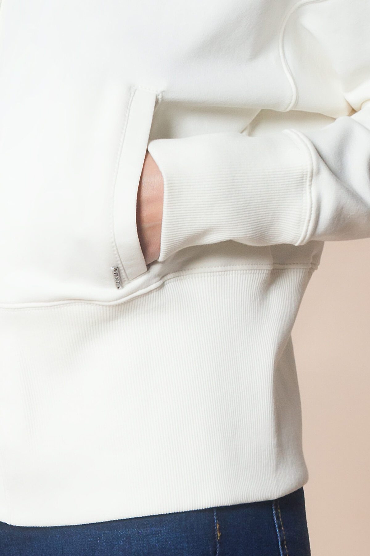 Худи выполнено из футера двухнитки средней плотности с высоким содержанием эластана. Металлическая фурнитура - блестящего золотистого цвета. В качестве шнура использована эффектная лента, что уводит стиль от спорта в повседневно-нарядный. Высокая рибана акцентирует талию.