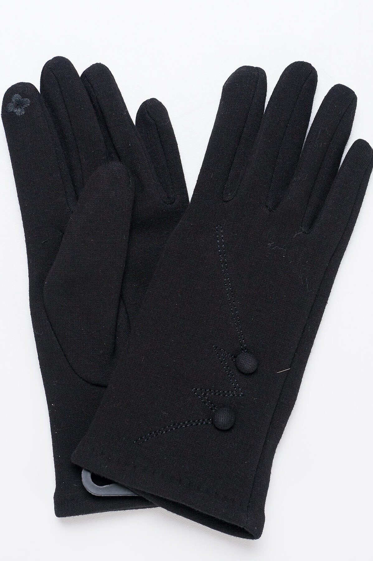 Женские перчатки,выполненные из трикотажного полотна, имитирующего внутри искусственный мех, декорированы вышивкой и пуговицами, на большом и указательном пальцах вышивка "сенсорными"нитками, размер 18. Продажи по 10 шт