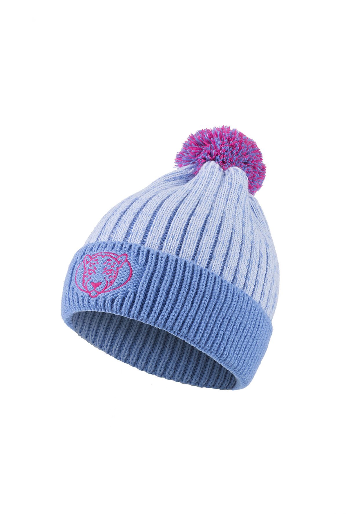 Теплая шапка для девочек с ярким помпоном и вышивкой спереди.