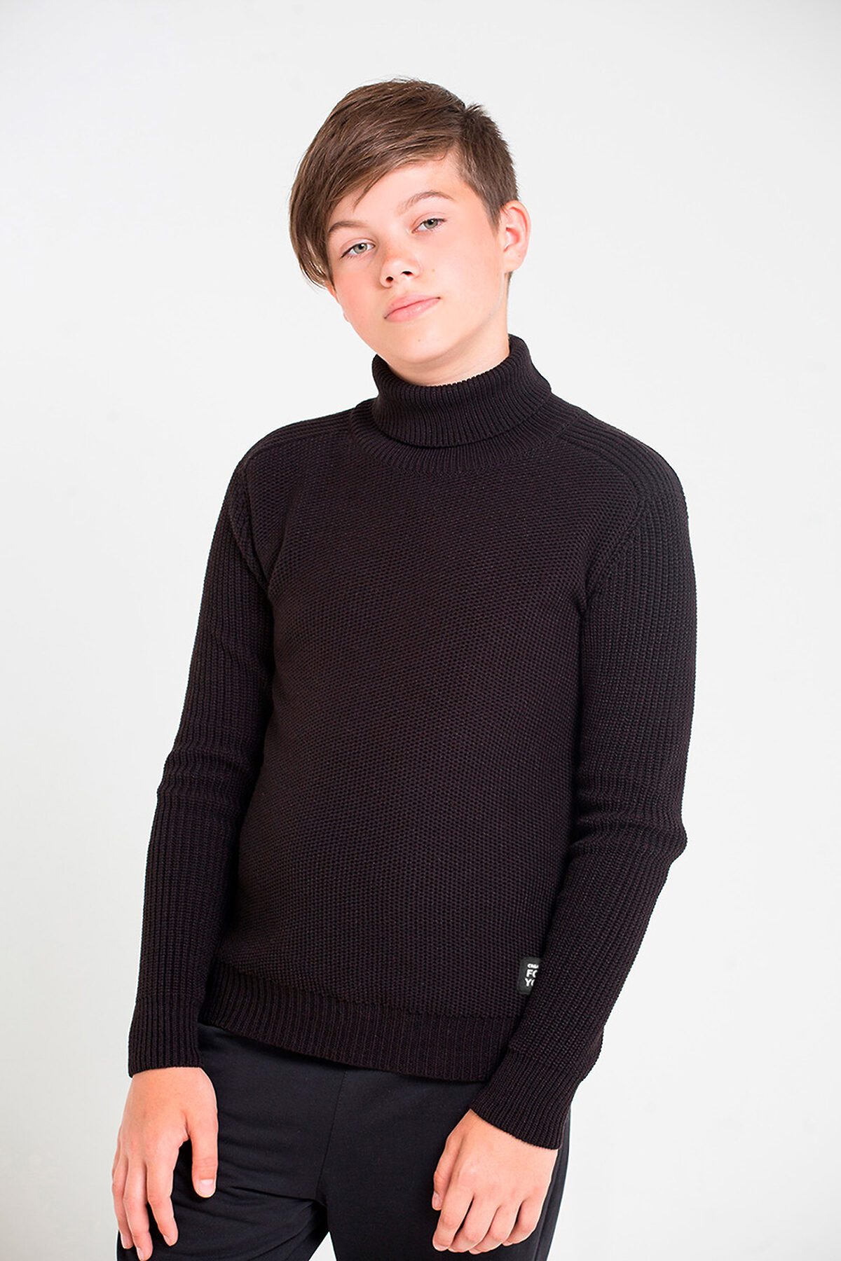 Вязаный джемпер из однотонной акриловой пряжи. Длинные втачные рукава со спущенным плечом. Эластичные манжеты, пояс и высокий воротник с отворотом. По низу боковых швов разрезы. Спереди нашивка.