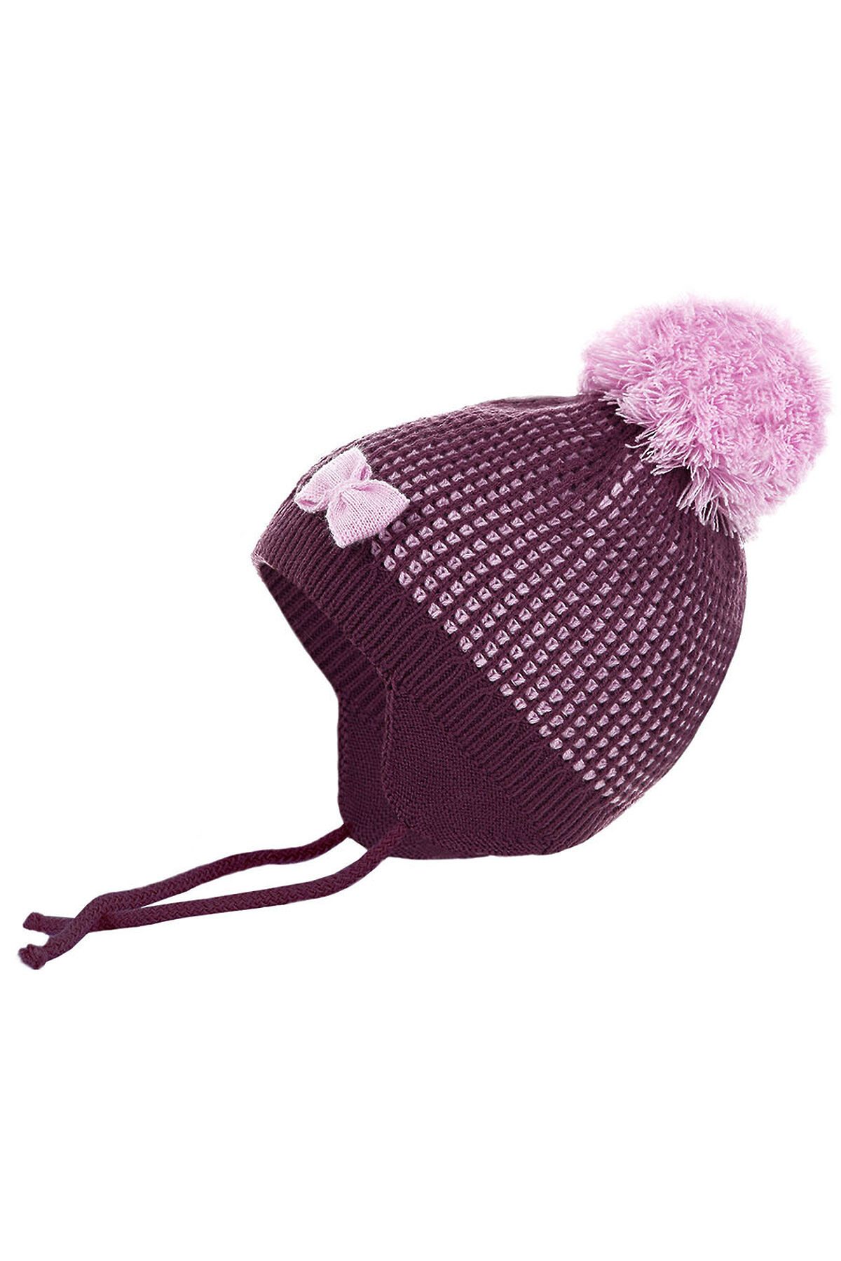 Шапка для девочек розового цвета, декорирована небольшим бантом спереди, на завязках с помпоном.