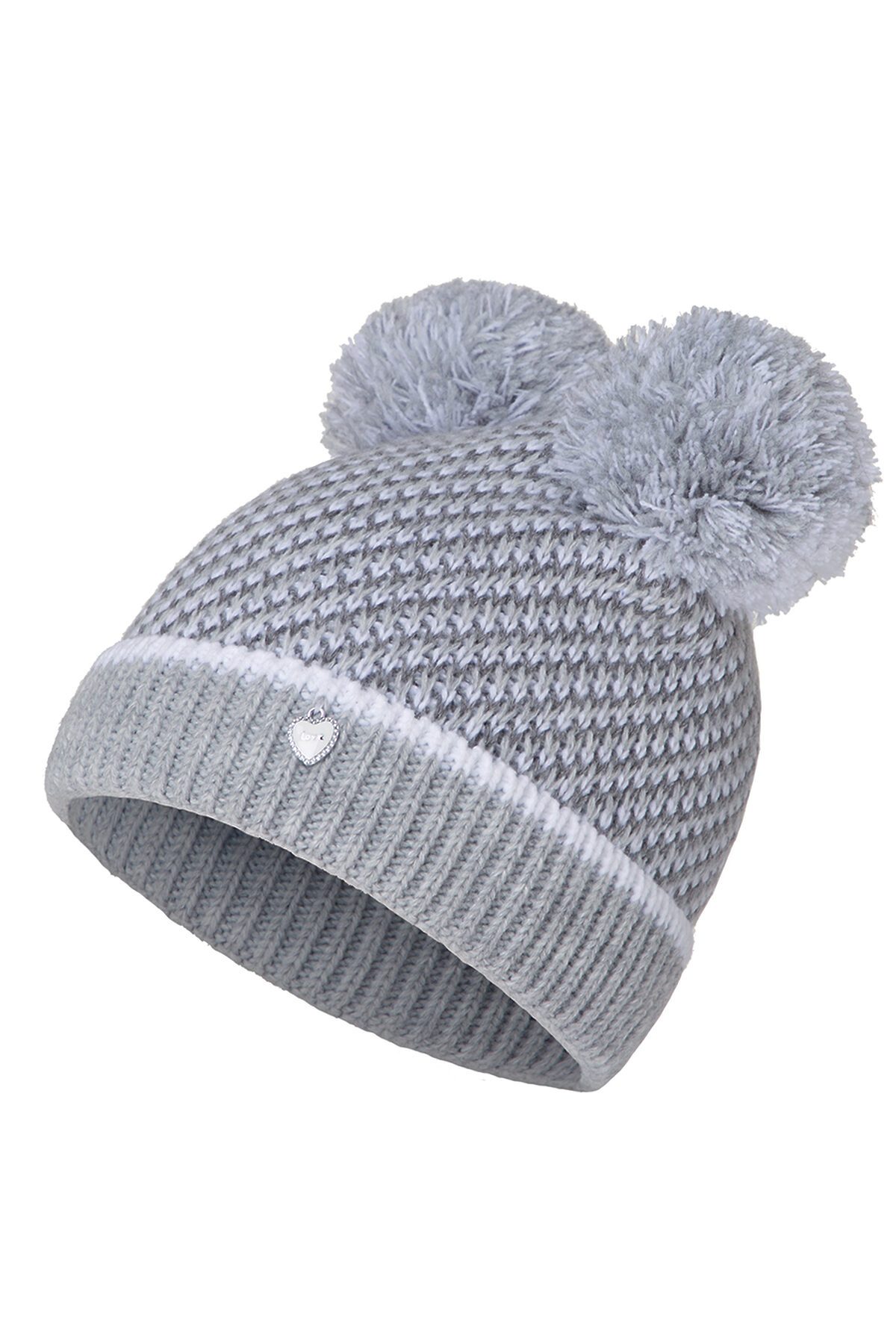 Мягкая, теплая шапка для девочек с двумя помпонами, декорирована спереди стразом в виде сердца.