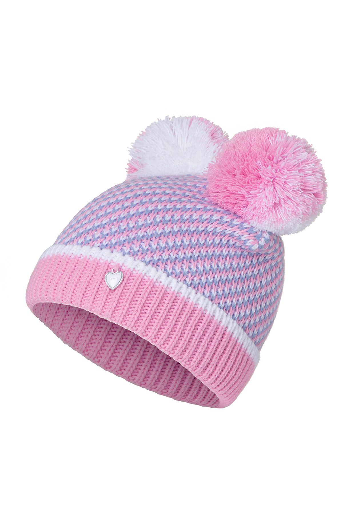 Мягкая, теплая шапка для девочек с двумя помпонами, декорирована спереди стразом в виде сердца.