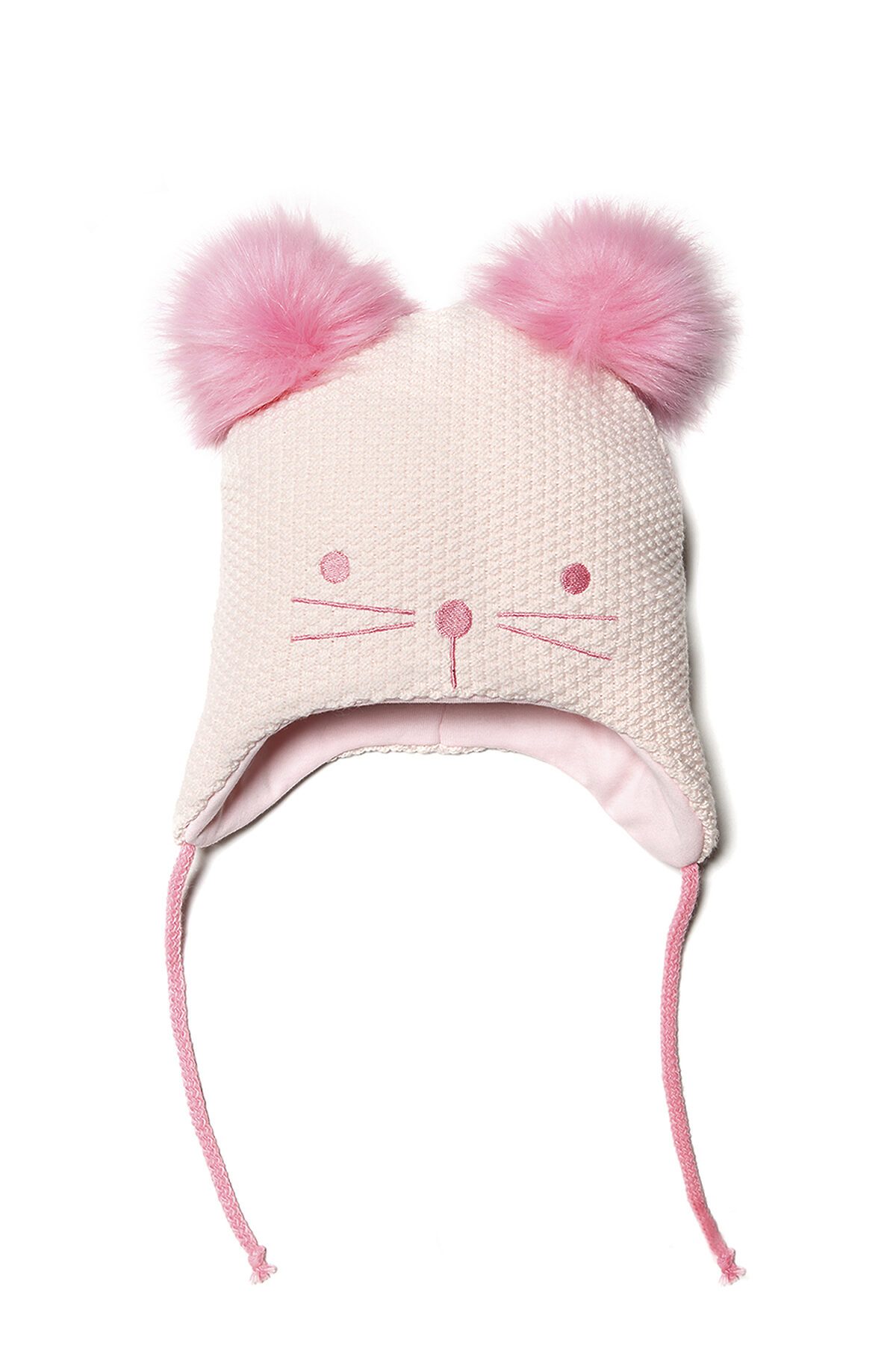 Теплая шапка для девочек на завязках с подкладкой из 100% хлопка и помпонами.