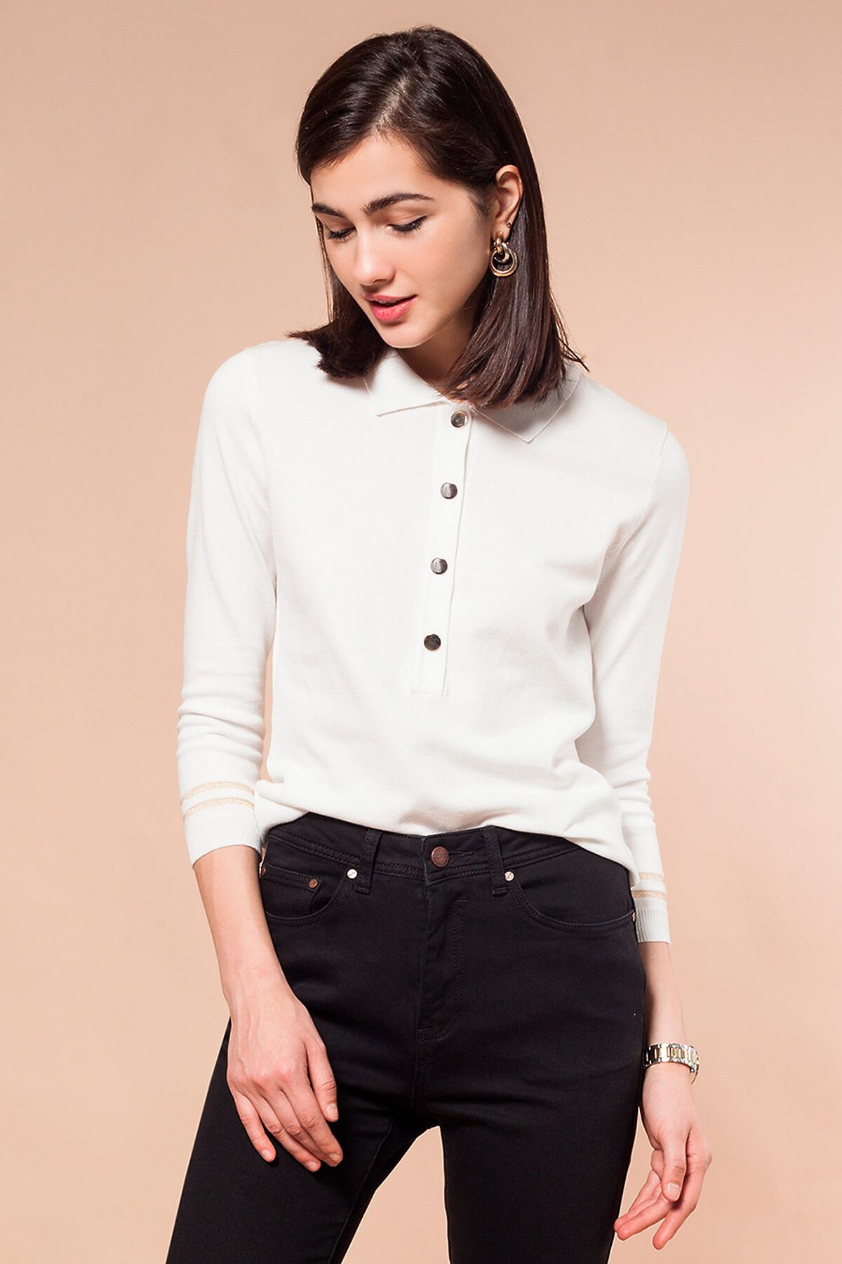 Джемпер - поло с золотистыми пуговицами и люрексом на рукавах. ВНИМАНИЕ!!! При выборе размера опирайтесь на фотографию с замерами изделия!