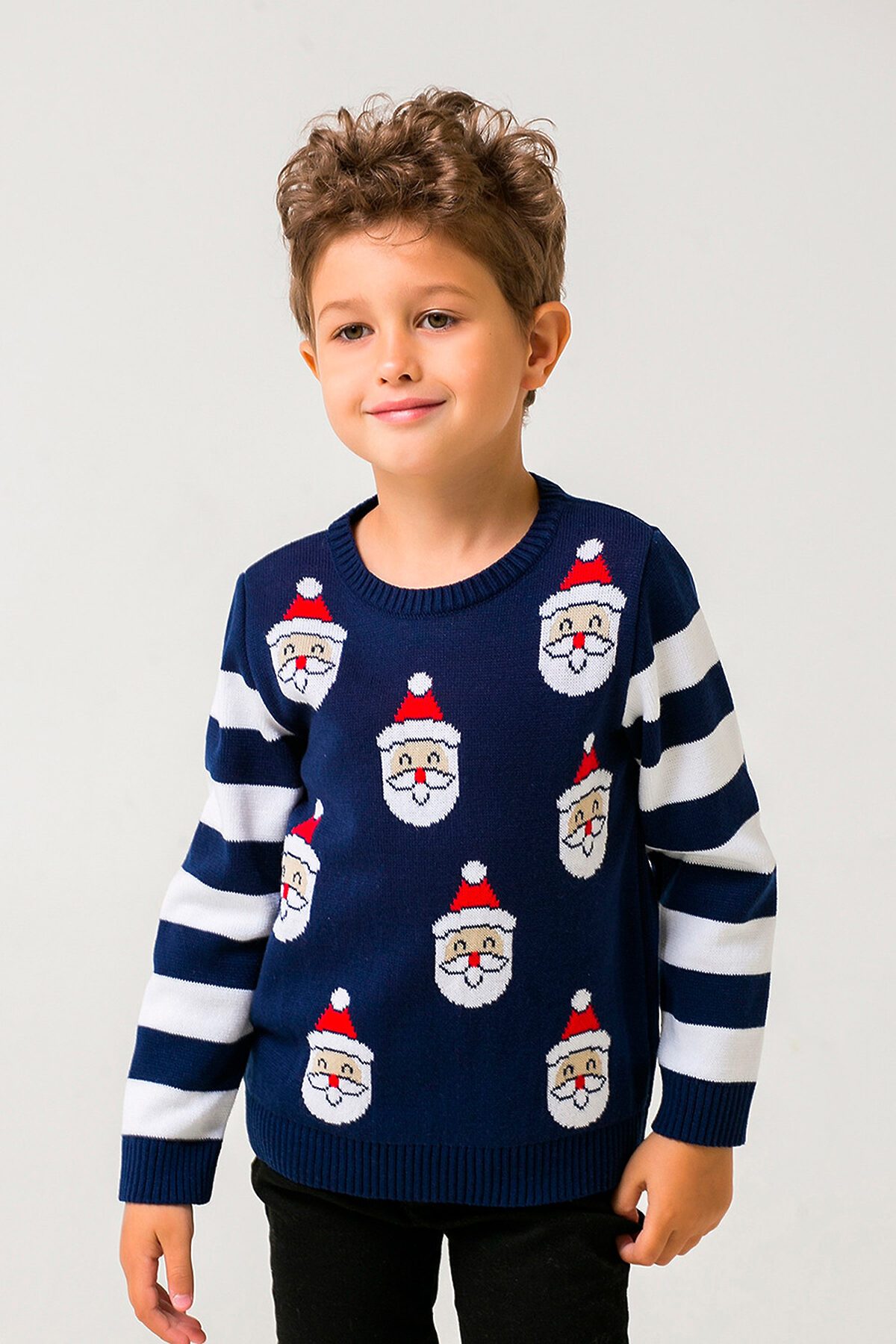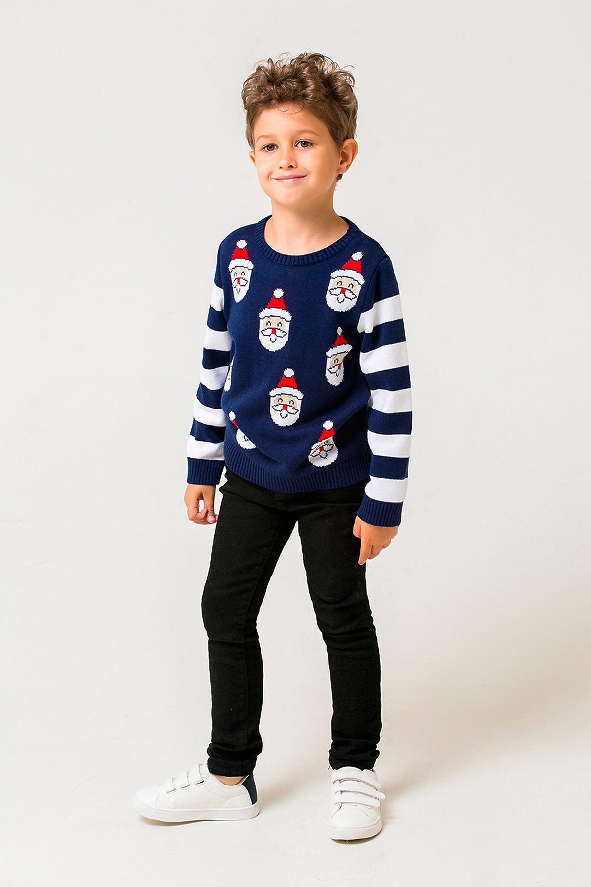 Вязаный новогодний джемпер для мальчика из акриловой пряжи. Длинные втачные рукава с вывязанными полосками. Эластичные манжеты, пояс и горловина. Спереди рисунок.