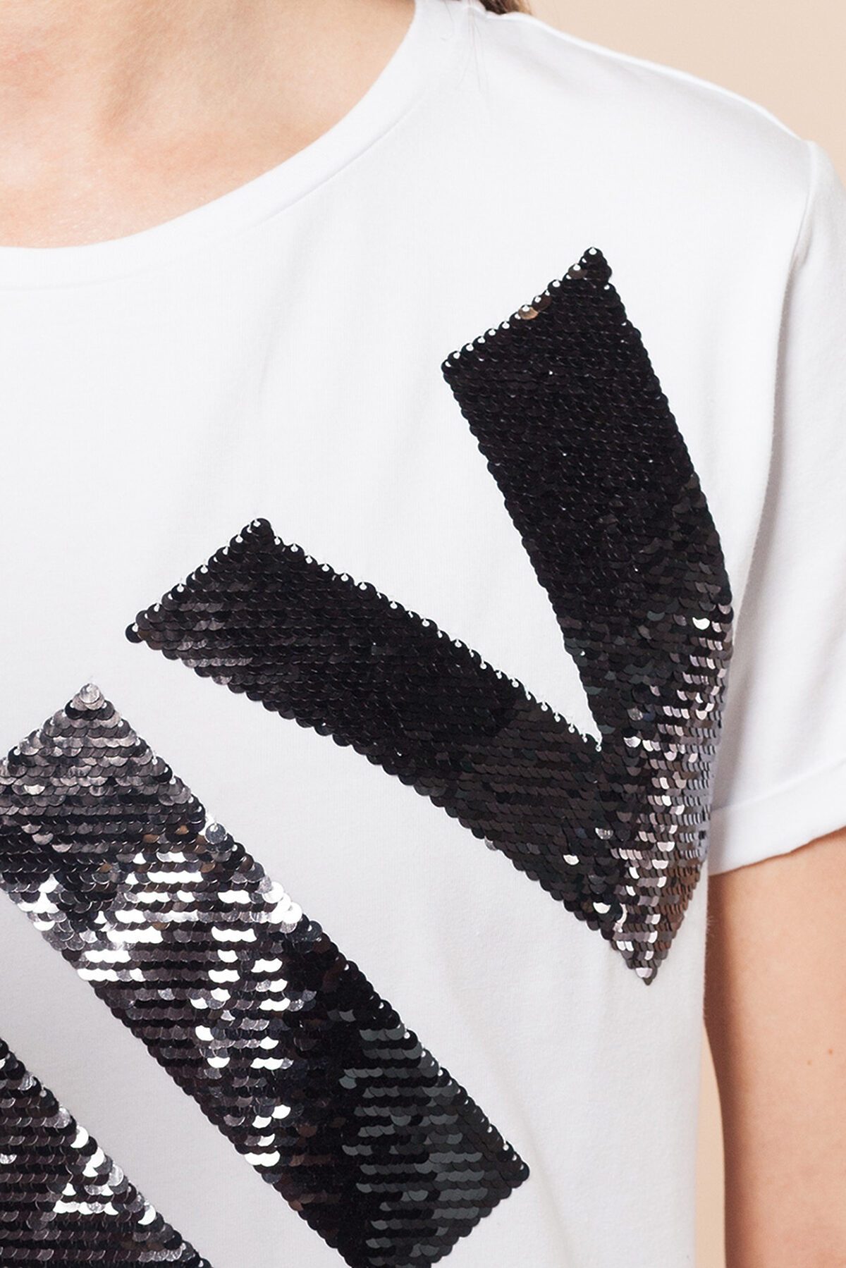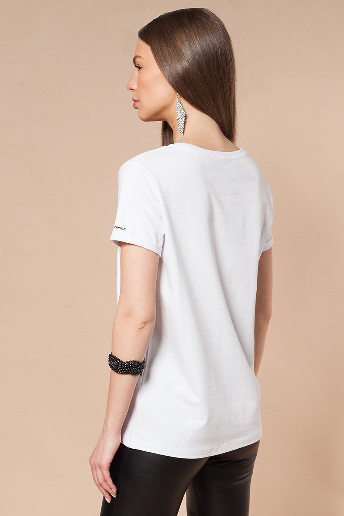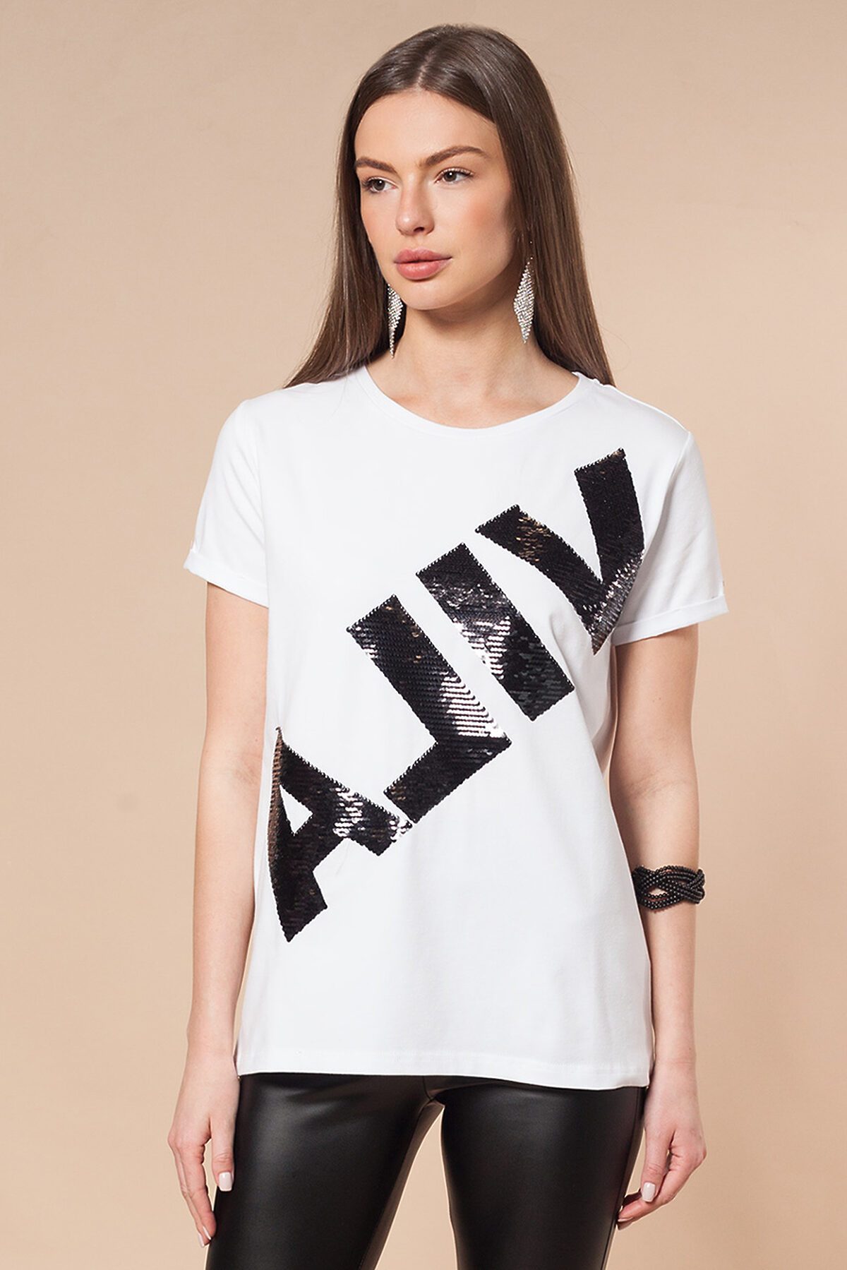 Футболка прямая с коротким рукавом, с золотистым принтом и вышивкой пайетками. ВНИМАНИЕ!!! При выборе размера опирайтесь на фотографию с замерами изделия!