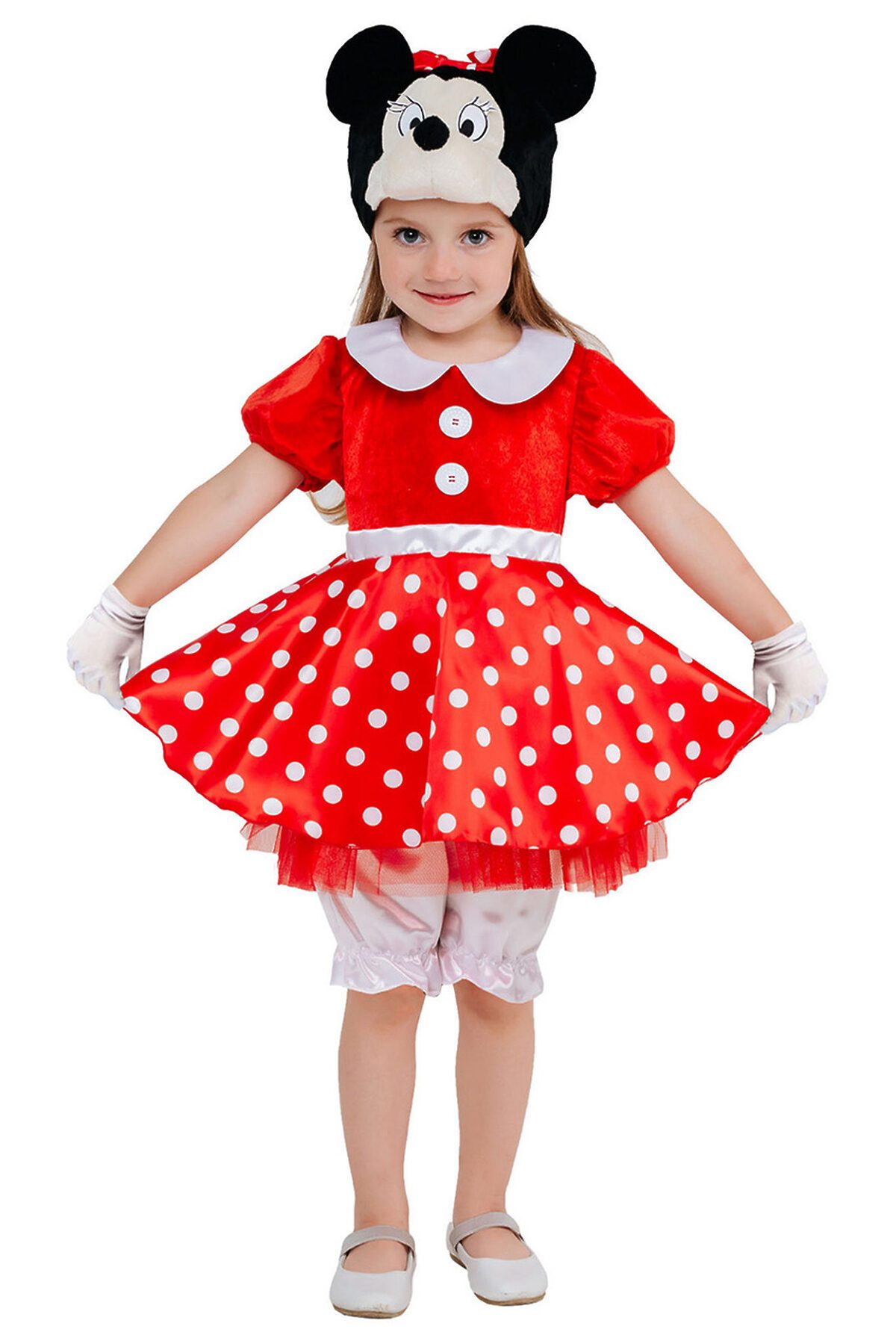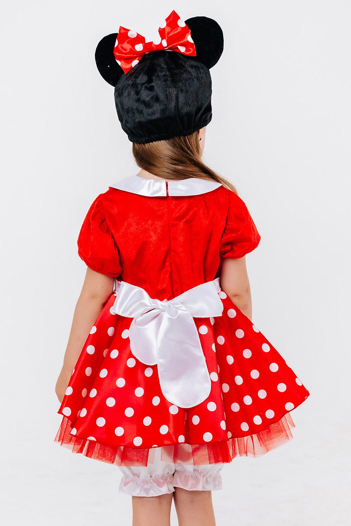 Костюм Минни Маус для детей - яркий образ для самых разных праздников. В комплект входит красное платье, белые панталоны и шапка-маска. Универсальный размер для девочек от 3 до 5 лет. Платье с белым отложным воротником и пуговицами на груди Короткие рукава-фонарики Сзади завязка на бантик Белые атласные панталоны на резинке Черная шапка-маска с ушками и мордочкой мышки.