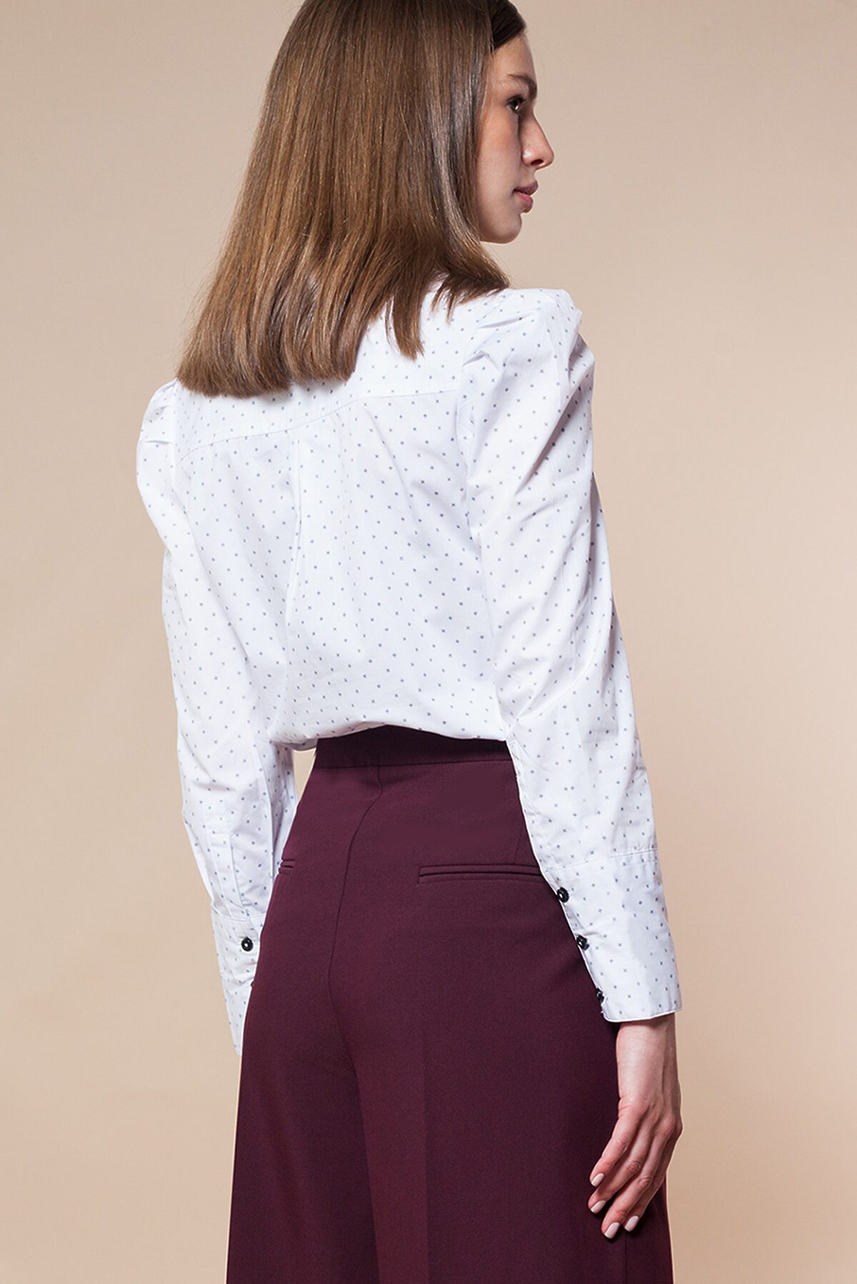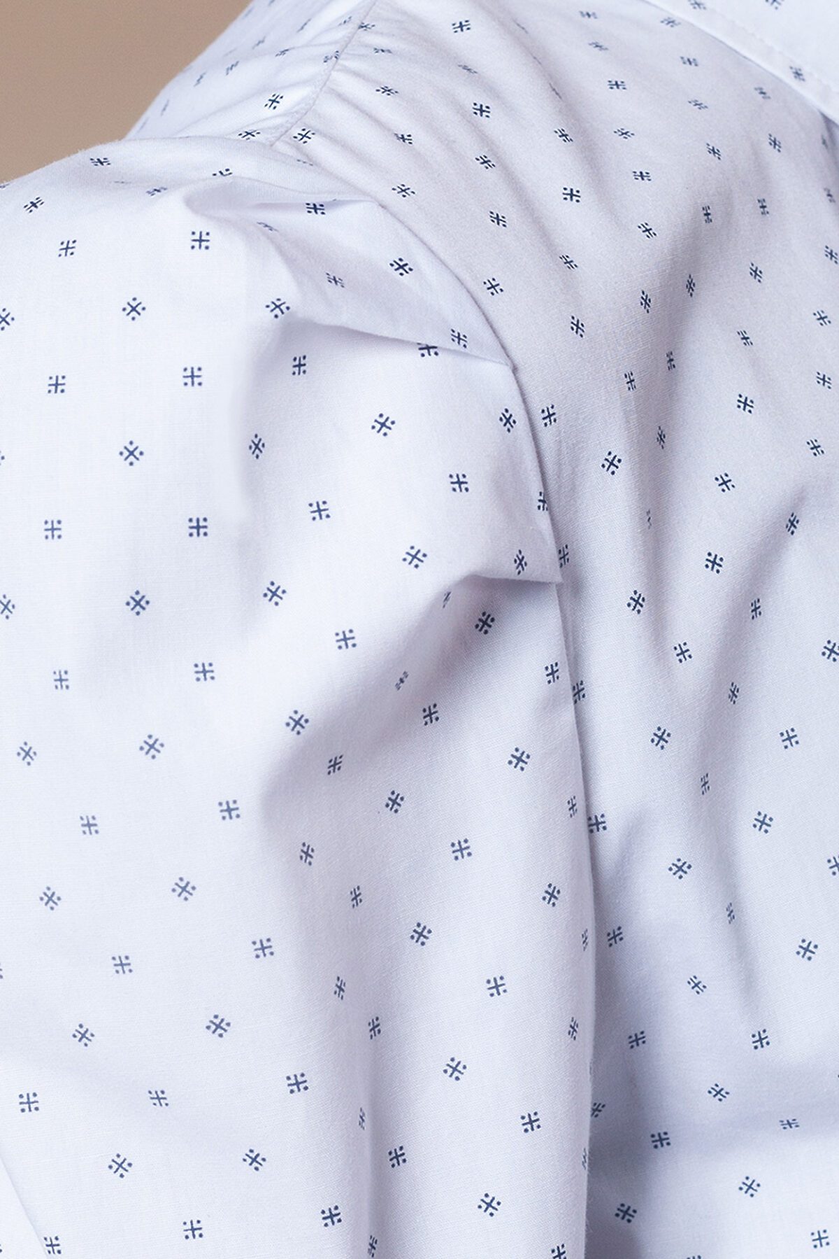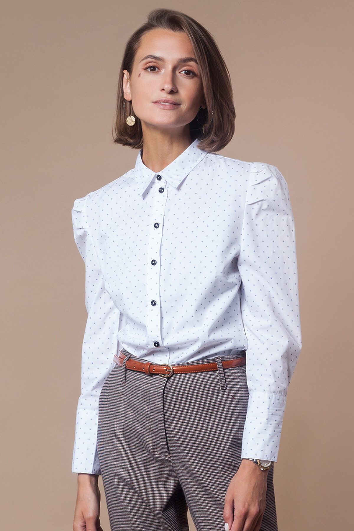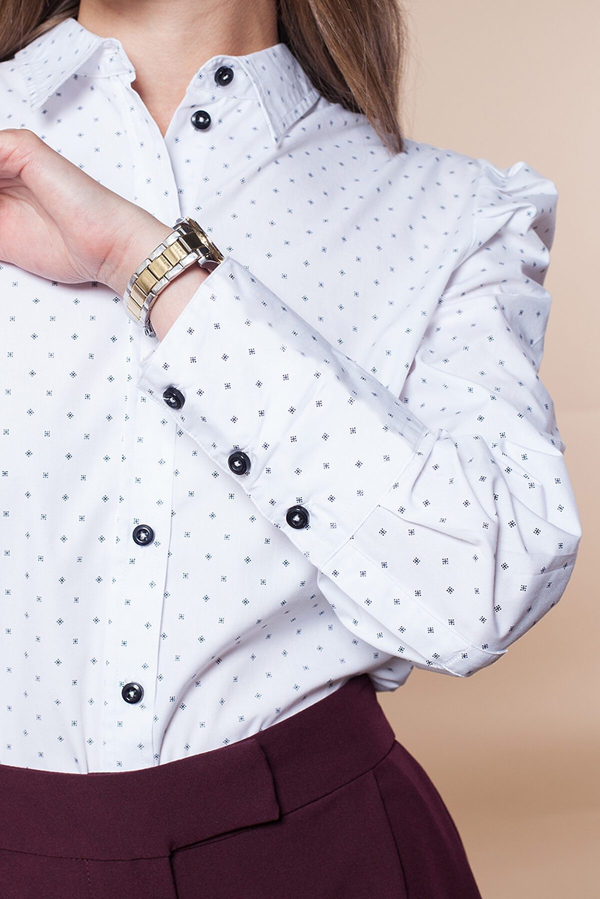 Блузка из хлопка с полиэстером. Полиэстер сохраняет гладкость и формоустойчивость ткани, делает ткань проще в уходе. Главным элементом блузки являются трендовые защипы по окатам рукава, которые становятся ведущим акцентом в любом луке. Особенный эффект создает игра мелкого рисунка ткани с контрастными пуговицами блузки. ВНИМАНИЕ!!! При выборе размера опирайтесь на фотографию с замерами изделия!