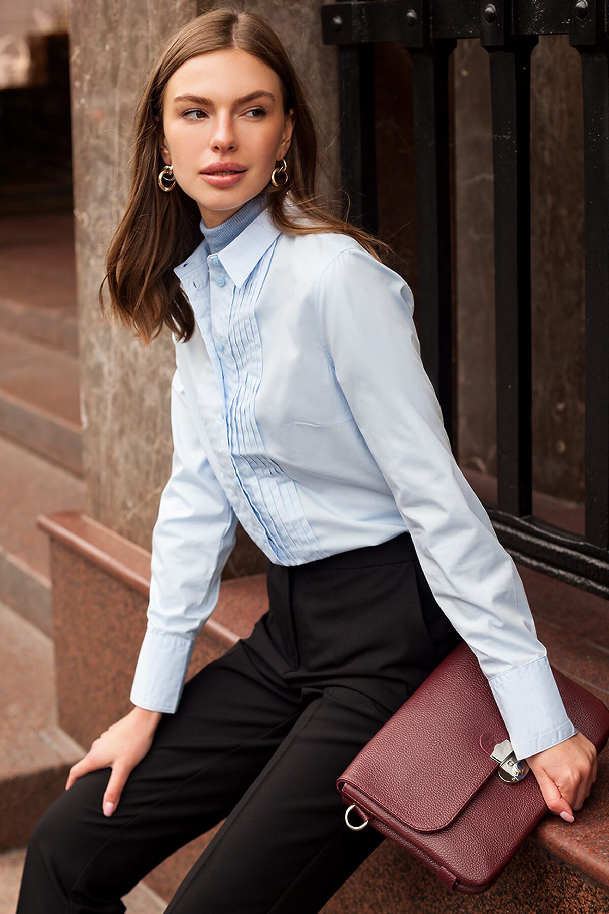 Классическая полуприлегающая блузка с эффективными складками спереди. Стилизована под мужскую сорочку под смокинг. Такая строгость с женственными низами создает соблазнительный образ, даже когда требуется самый строгий дресс-код. В состав ткани к хлопку добавлен полиэстер, который обеспечивает формоустойчивость, комфорт в уходе и долговечность. ВНИМАНИЕ!!! При выборе размера опирайтесь на фотографию с замерами изделия!