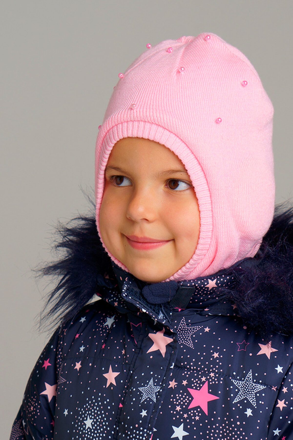 Трикотажная шапка-шлем подкладка из флиса защищает шею и голову от холода и ветра декор - бусины