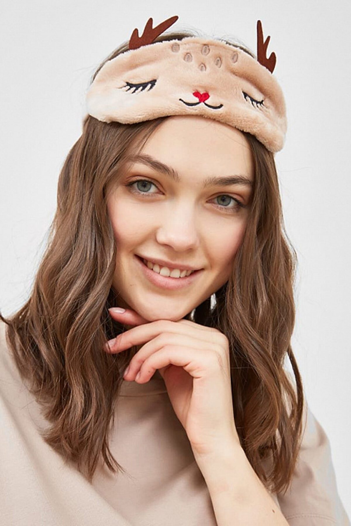 Повязка на голову для сна в виде мордочки олененка. Верхняя часть выполнена из трикотажного полотна с меховым ворсом, внутренняя часть – из интерлока и фетра. Практичная повязка в нетривиальном дизайне! Цена указана за 2 шт.