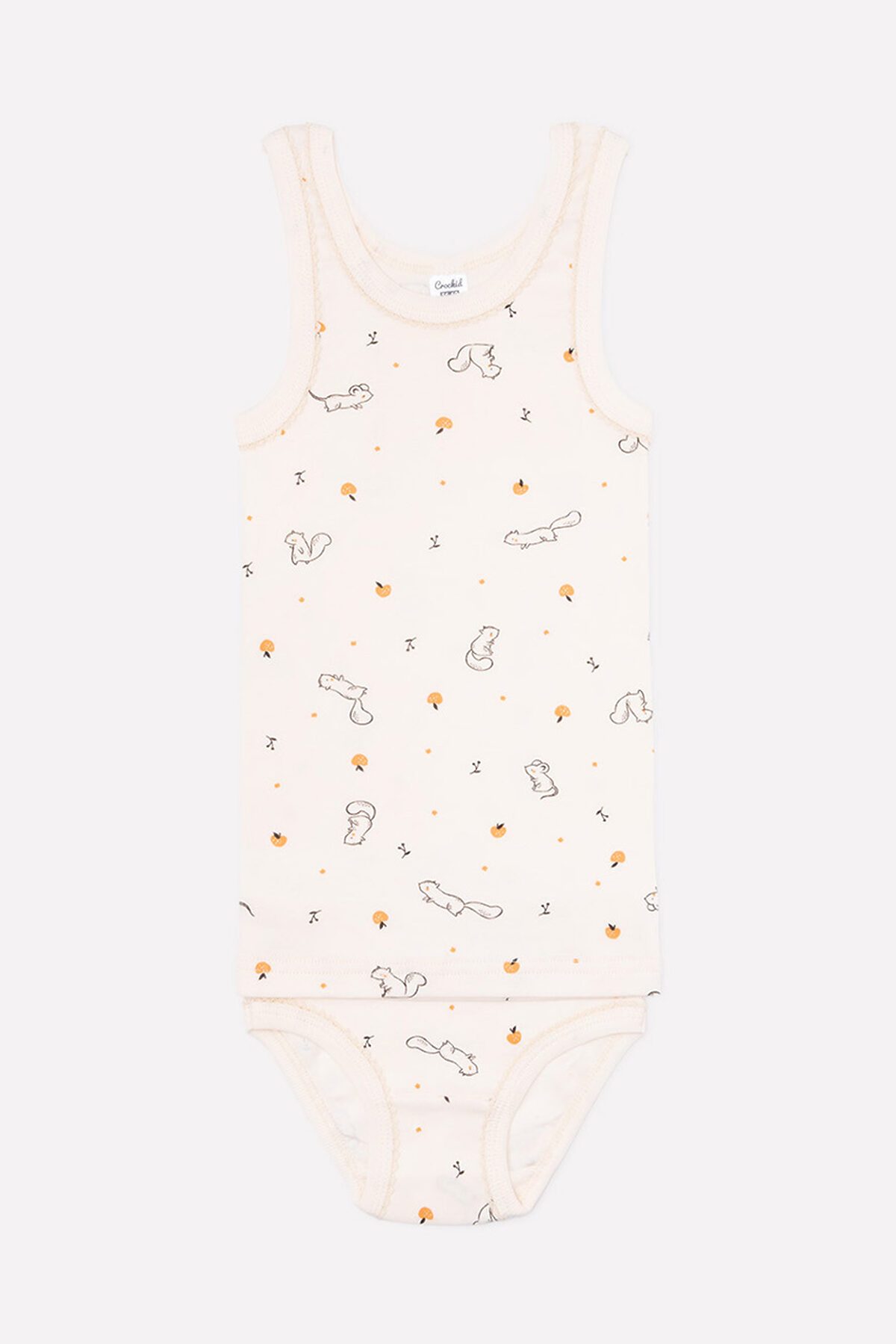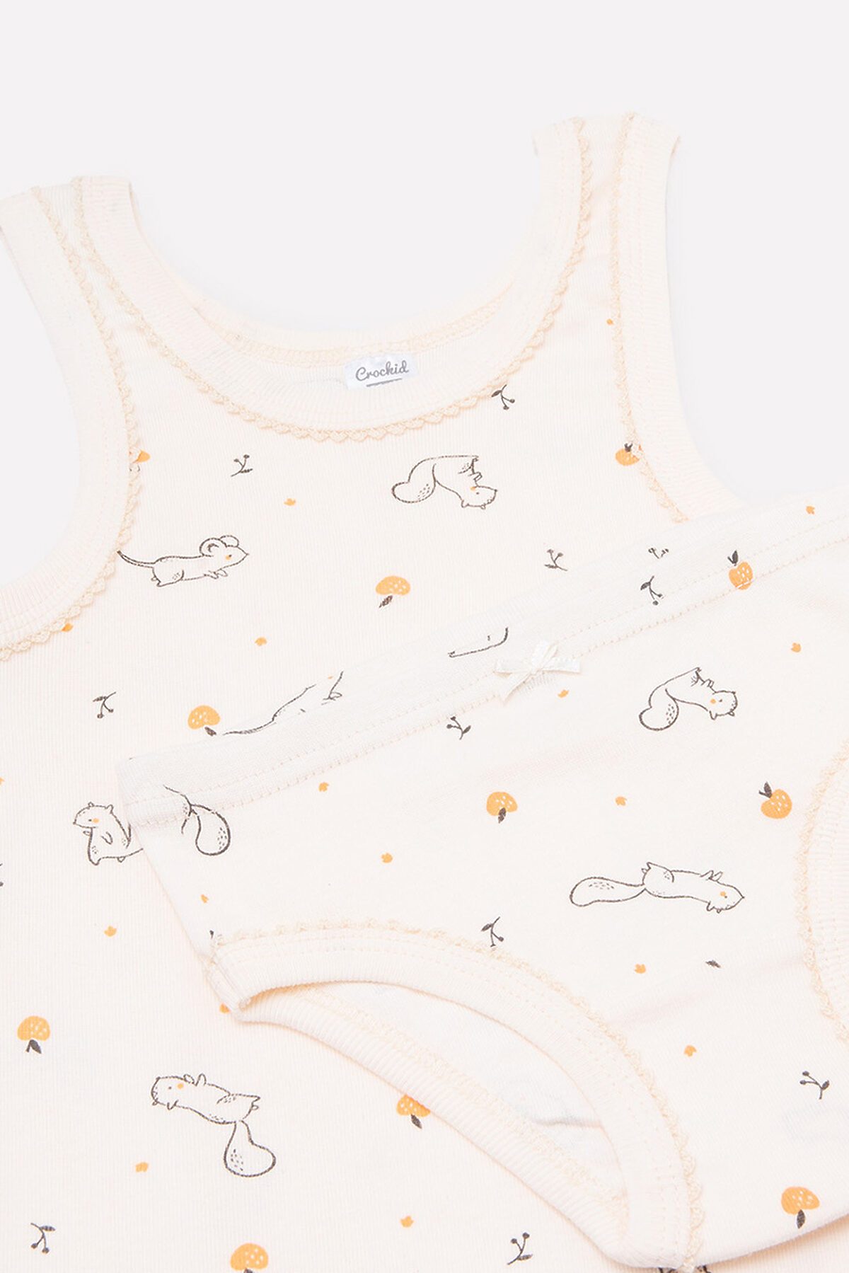 Комплект для девочки сливочного цвета с набивным принтом "Маленькие белочки". Мягкие трикотажные майка с широкими лямками и трусики с нарядным бантиком.