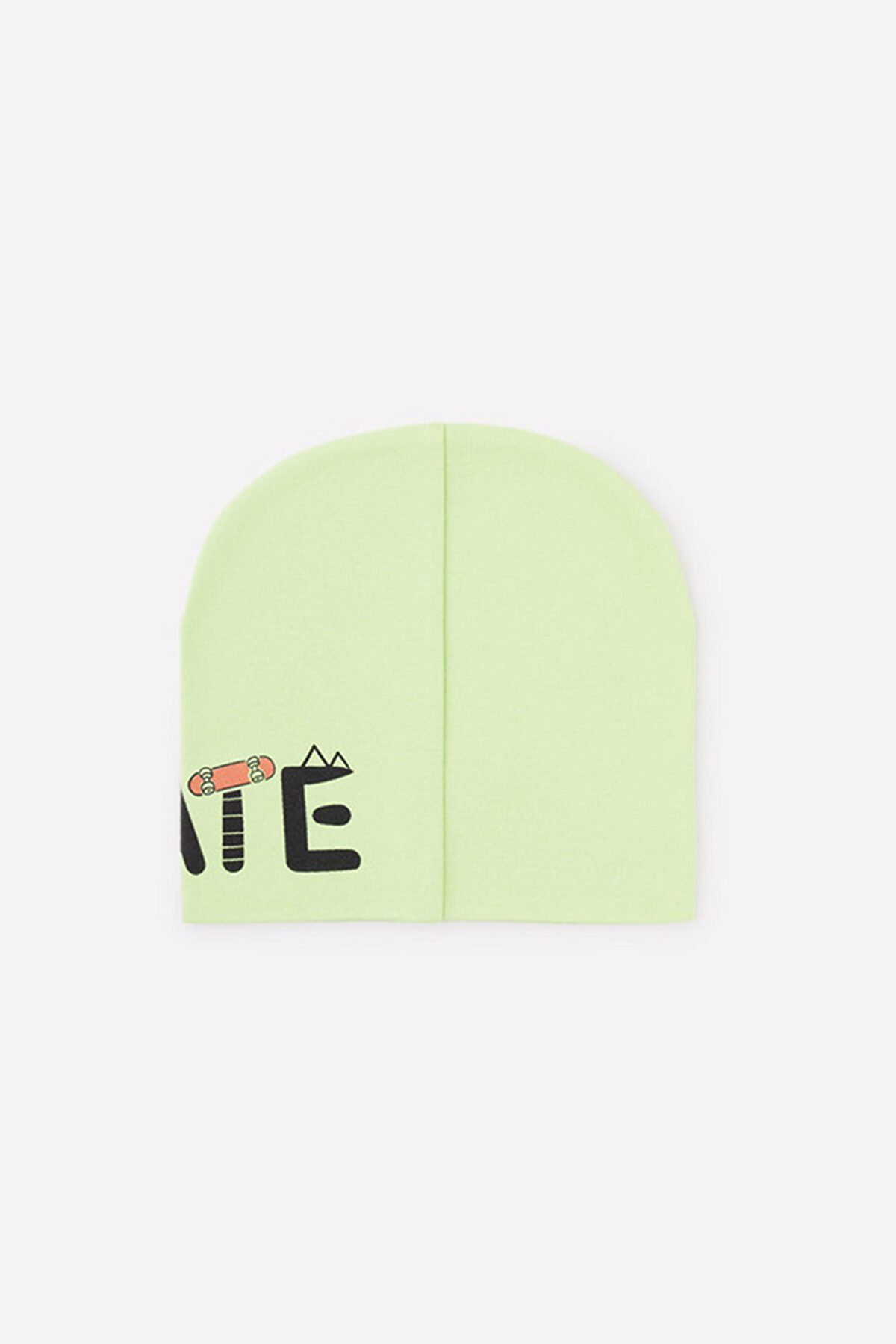 Шапочка из однотонного эластичного трикотажа, двойная. Удлиненная скругленная макушка. Спереди принт.