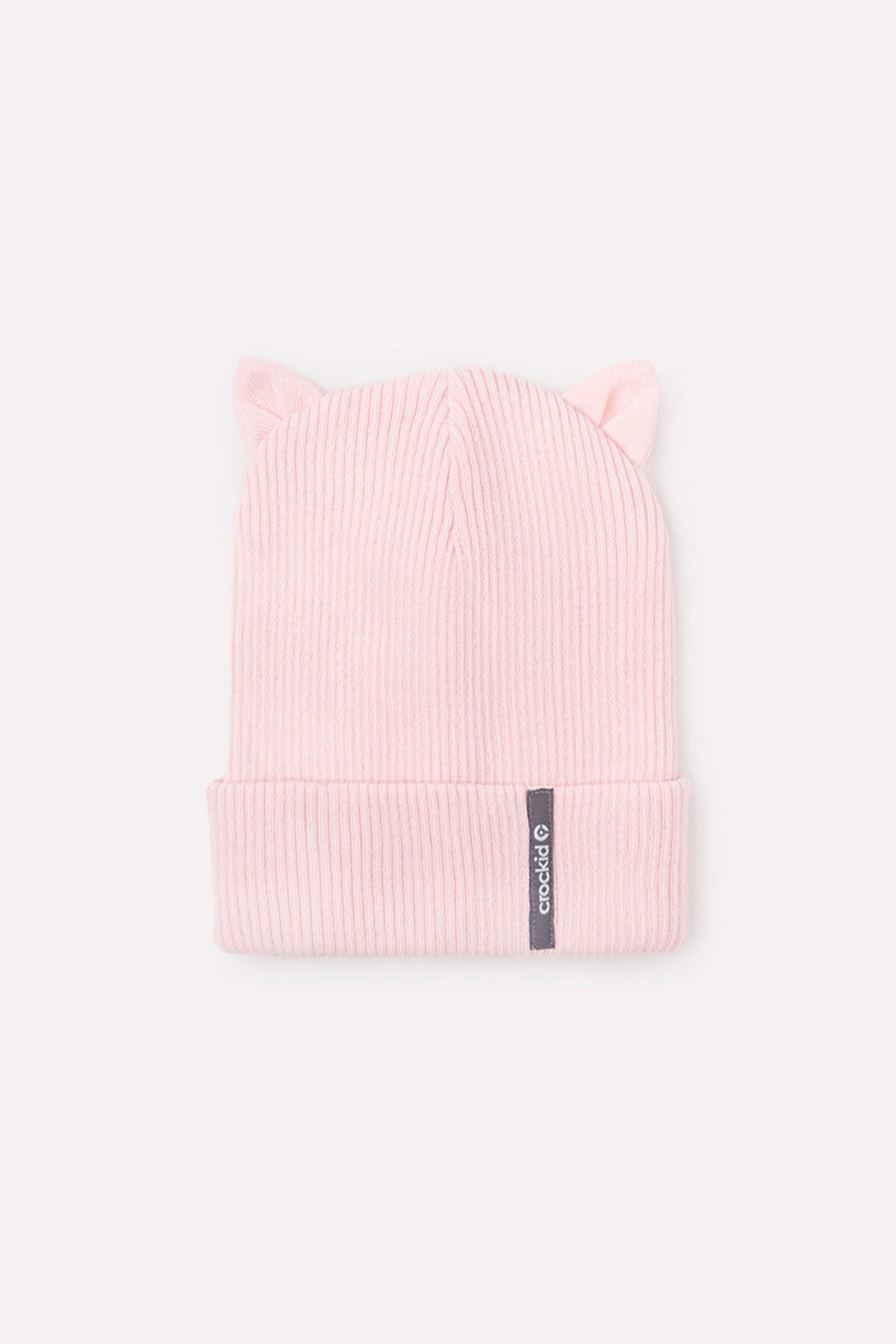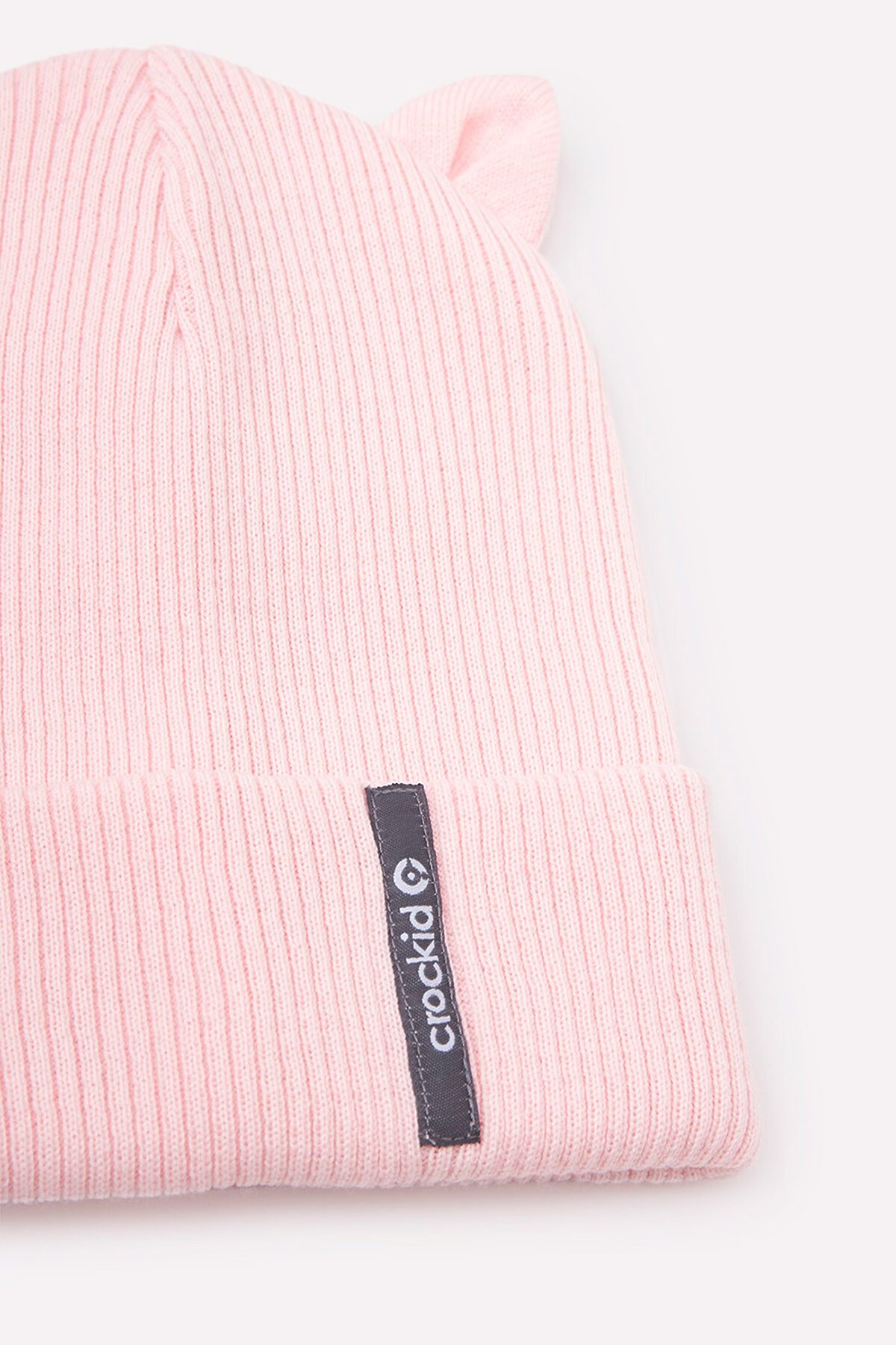 Шапка из акрила персикового цвета с кошачьими ушками. Широкий отворот украшен жаккардовой ленточкой с надписью CROCKID.
