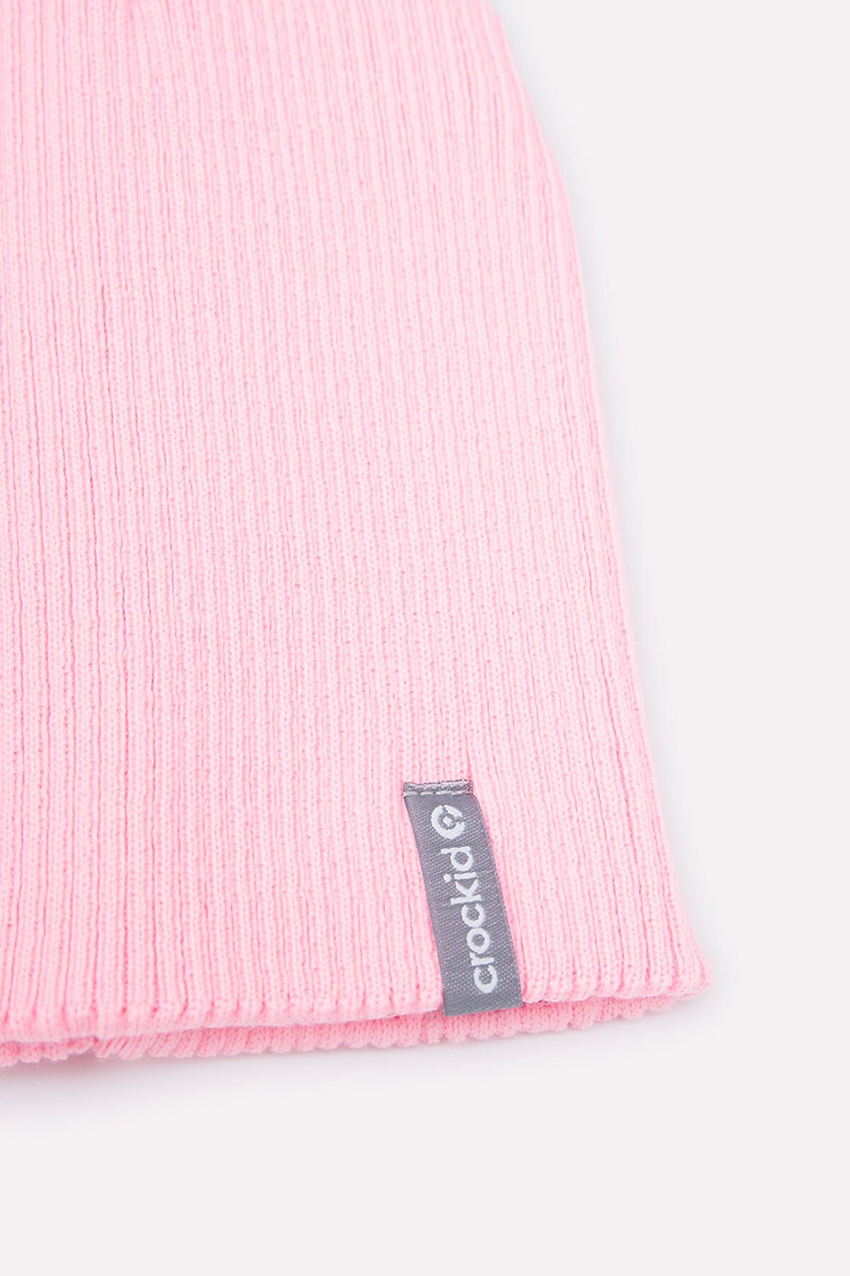 Двойная вязаная шапочка из акрила нежно-розового оттенка. Украшена жаккардовой этикеткой с названием бренда CROCKID.