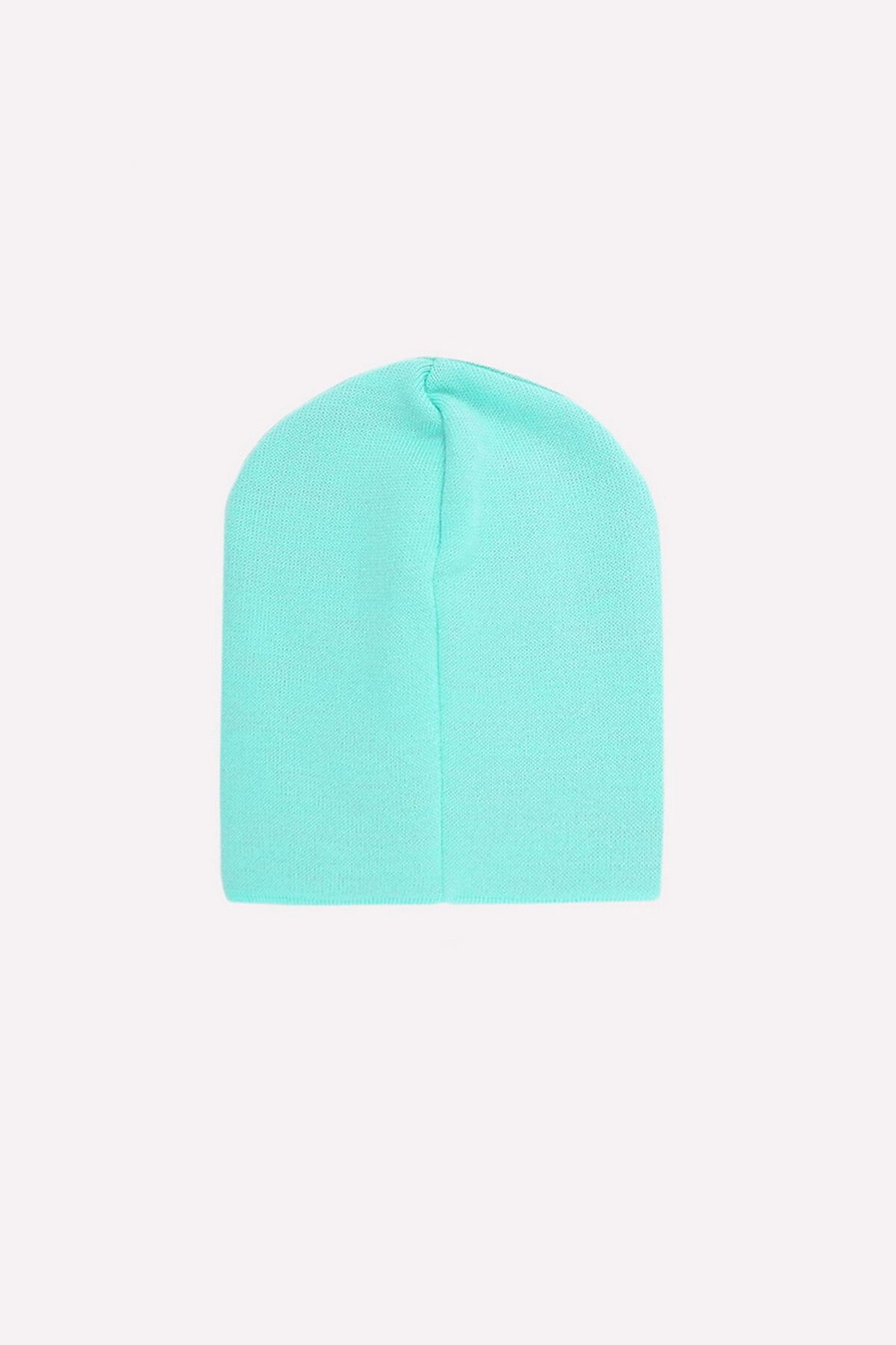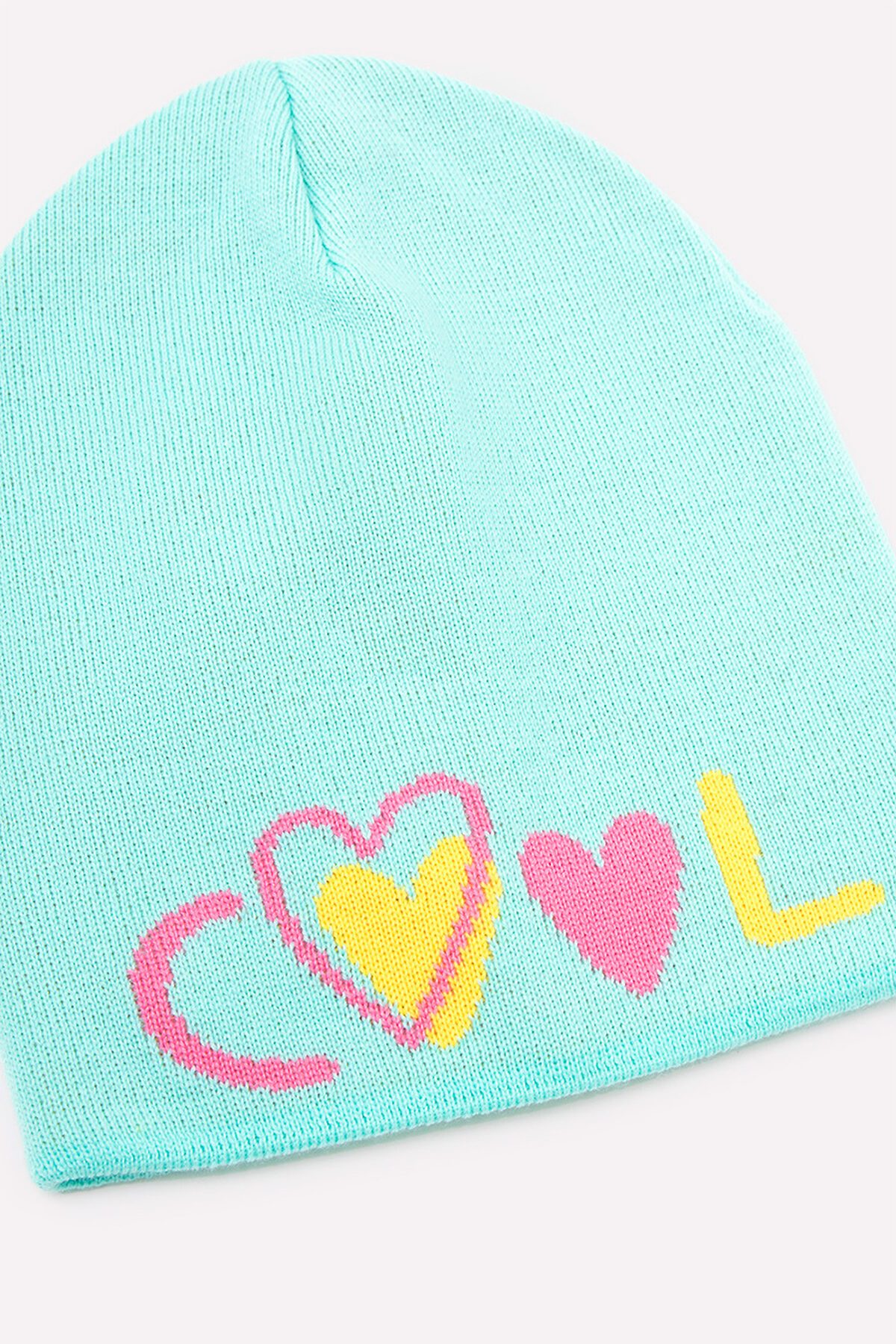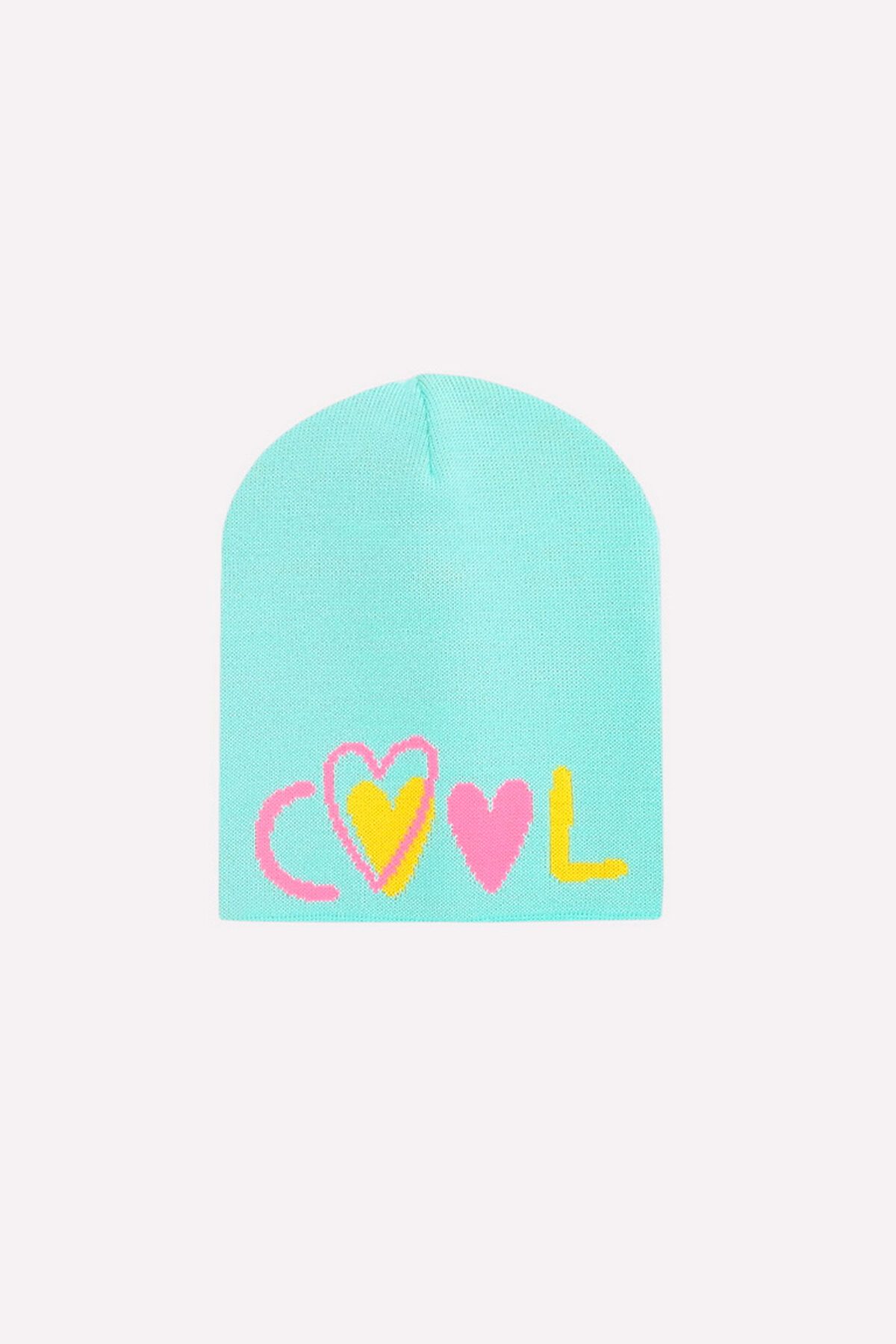 Двойная шапка для девочки светло-бирюзового оттенка. Впереди - вывязанная надпись.
