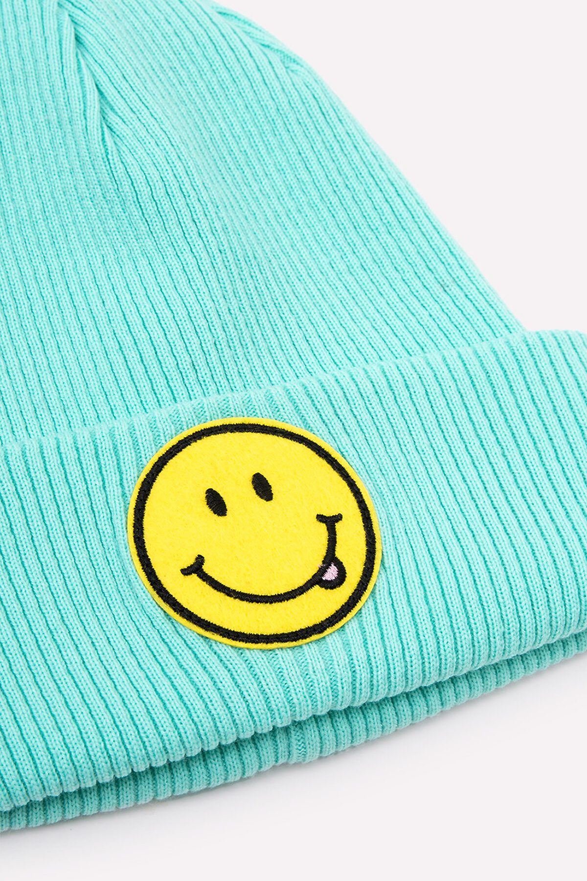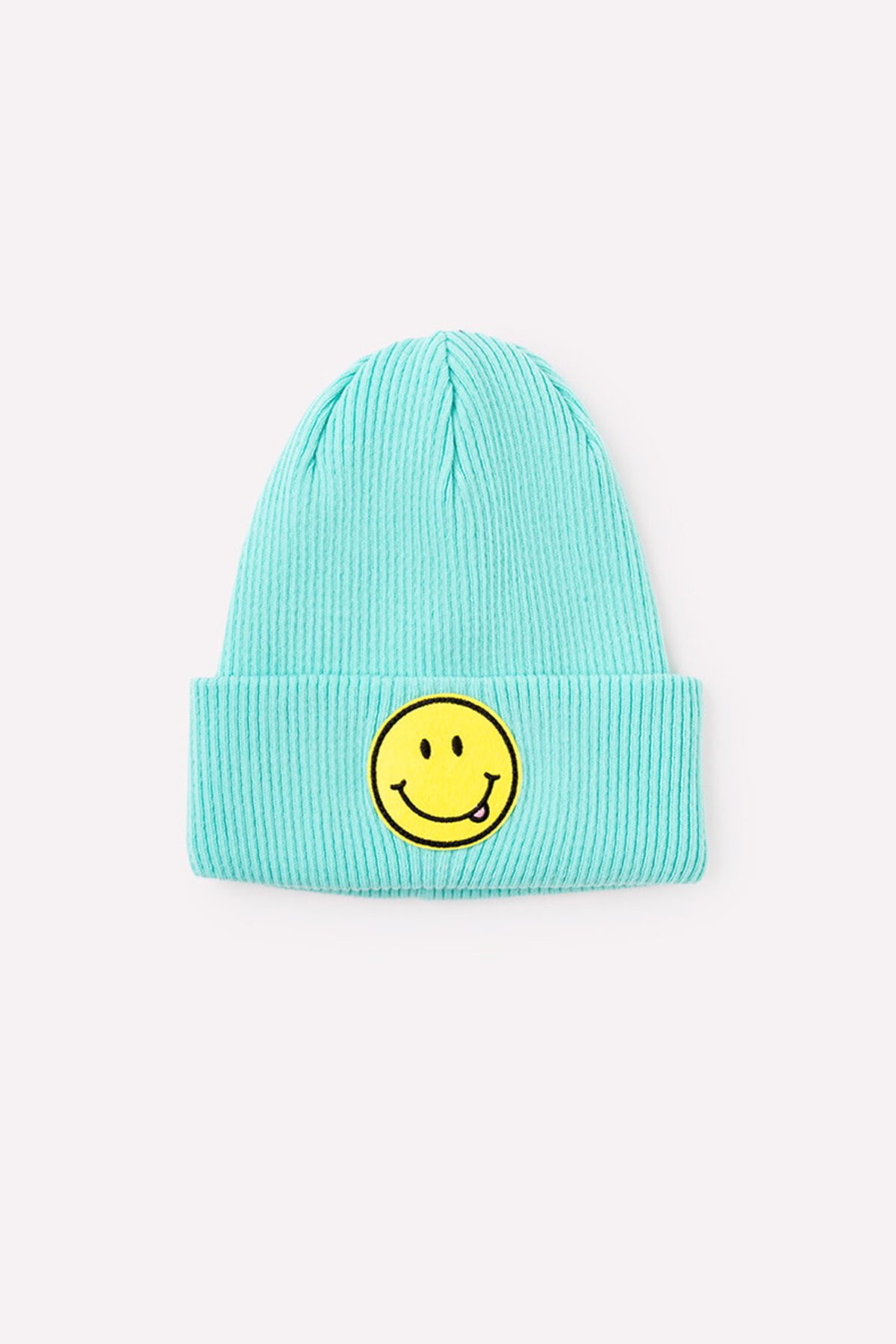Двойная шапка из акрила светло-бирюзового оттенка. На широком отвороте - фетровая нашивка в виде забавного смайлика.