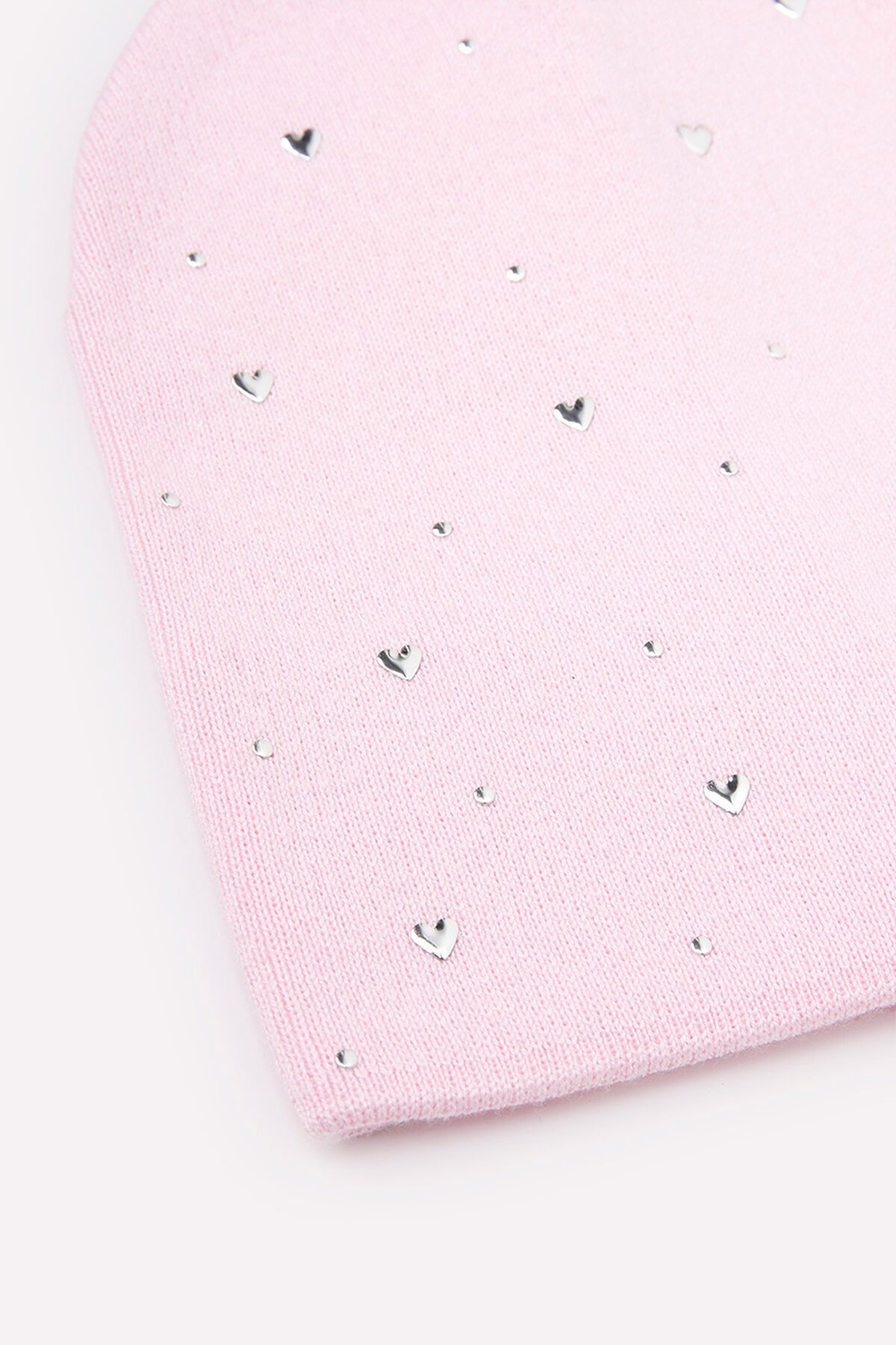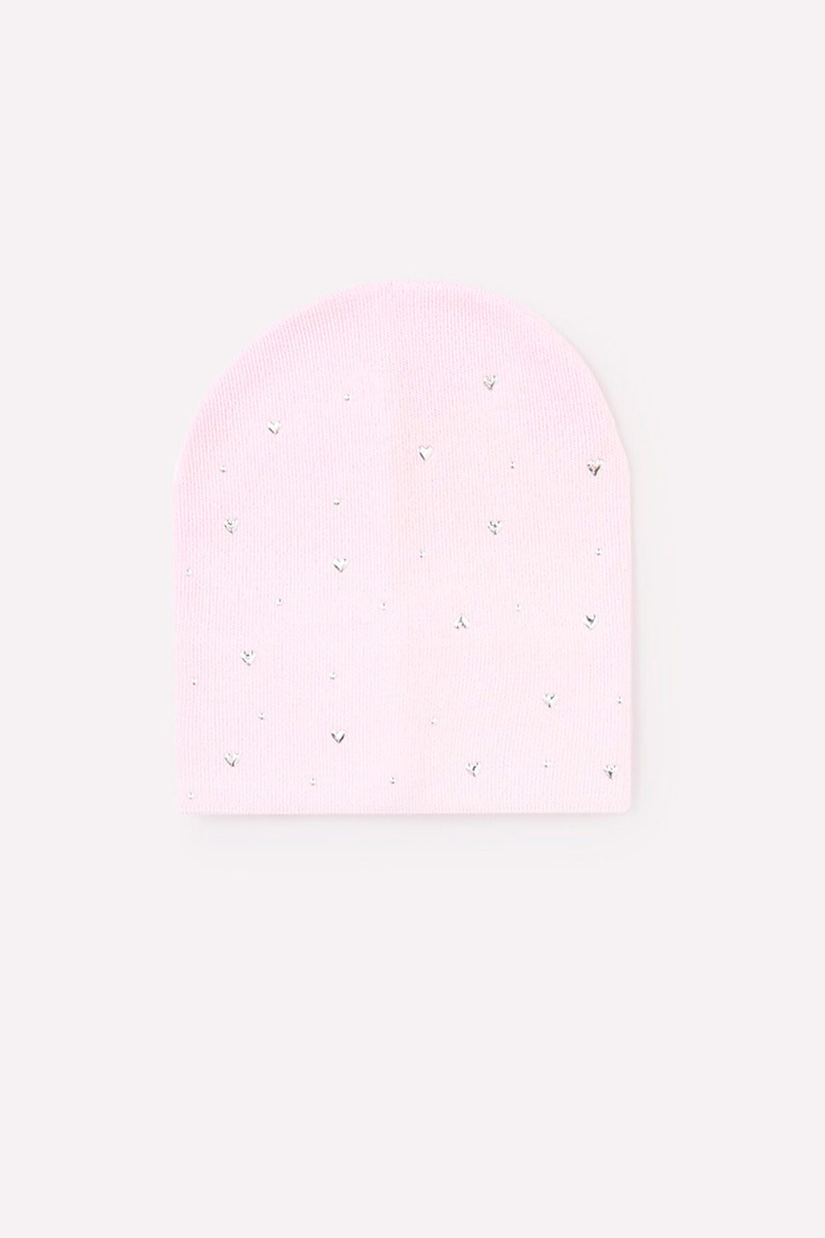 Хлопковая шапочка светло-розового оттенка с внутренним отворотом. Впереди украшена стразами.