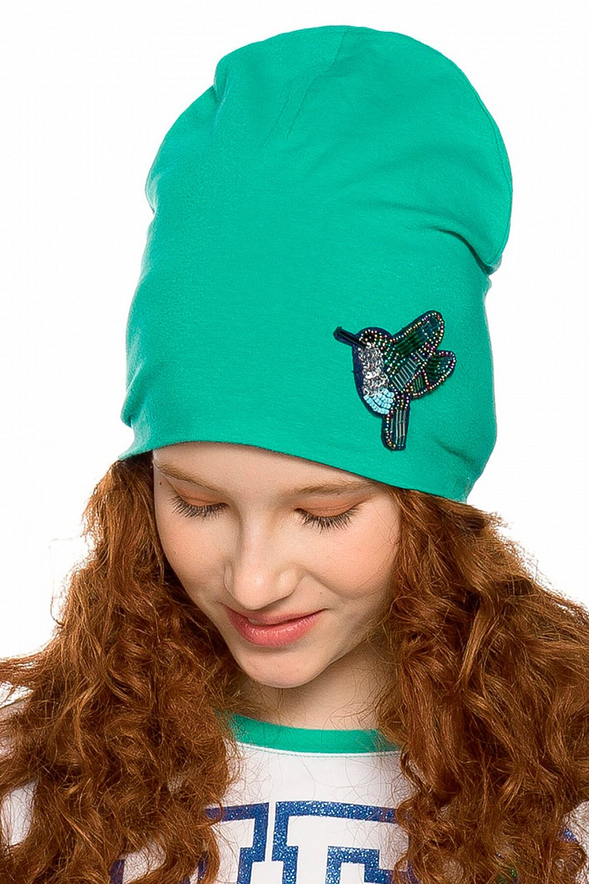 Трикотажная шапка из тонкого эластичного хлопка декорирована нашивкой из бисера и переливающихся пайеток в виде птички колибри.