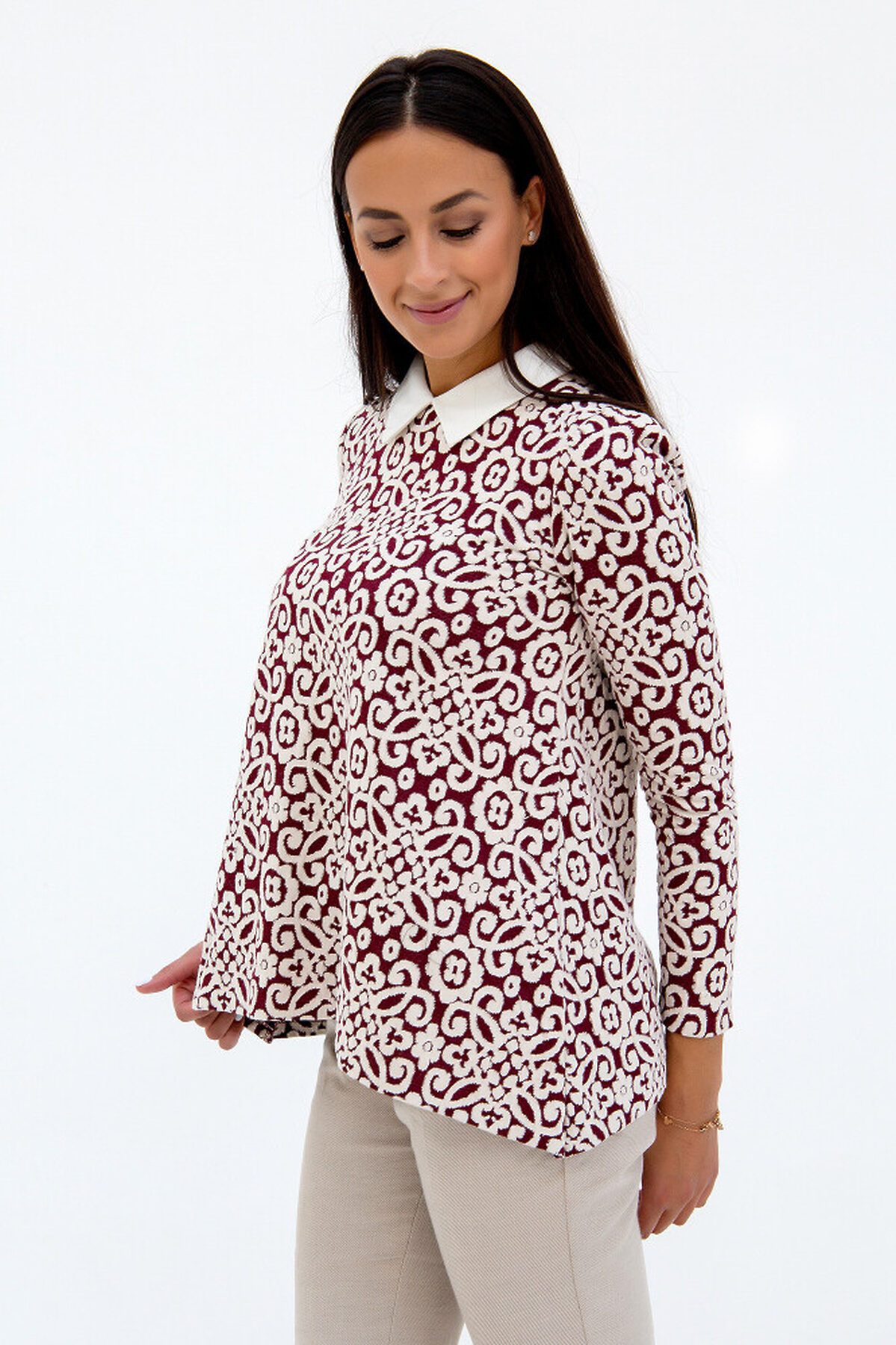 Стильная туника оформлена контрастным узором, напоминающим растительные мотивы. Модель с ассиметричным кроем подола, что делает изделие запоминающимся. Воротник отложной рубашечного типа. Состав: 80% полиэстер, 15% вискоза, 5% эластан. Длина изделия 63 см. Рост модели на фото 173 см.