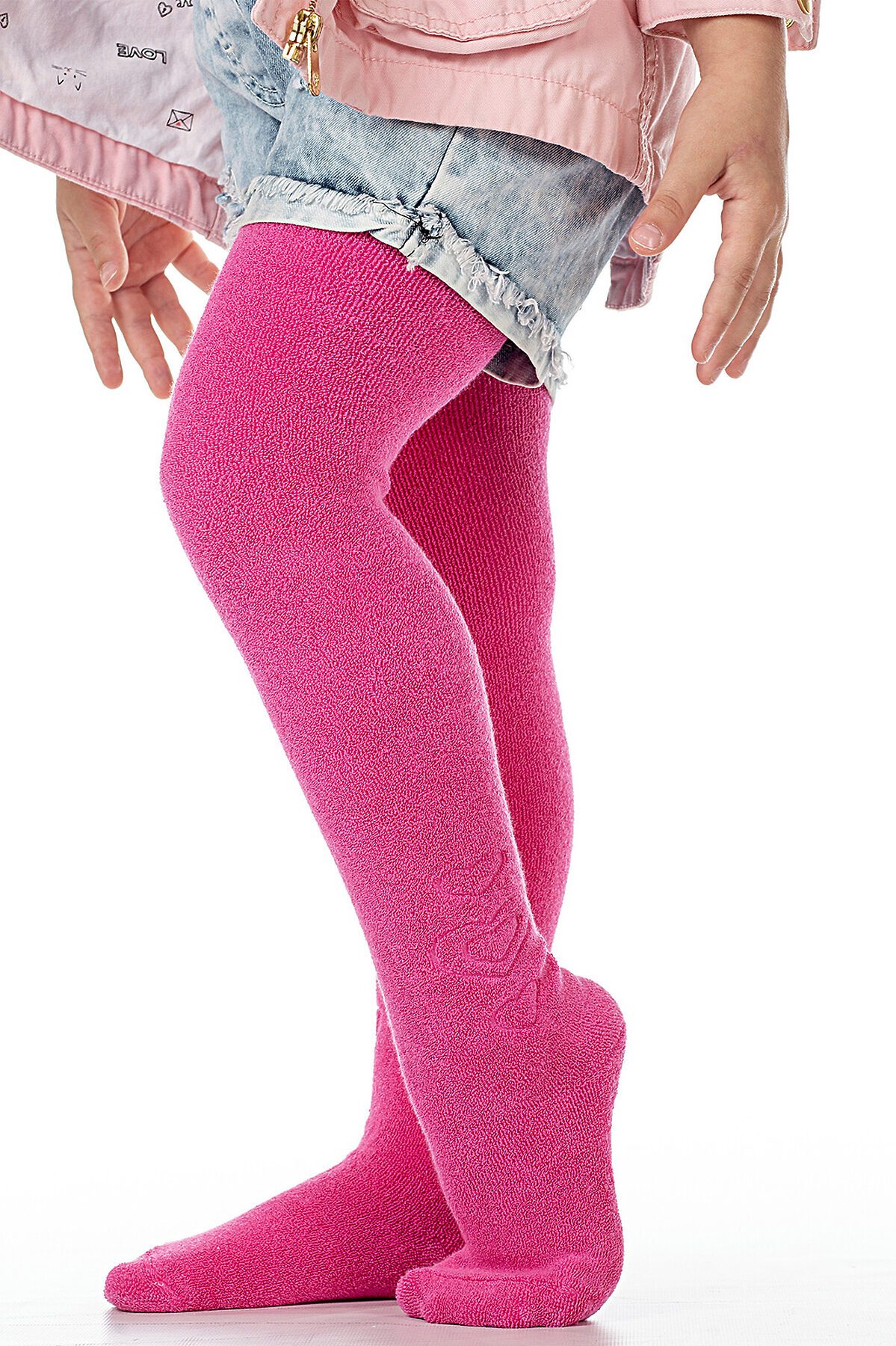 Теплые хлопковые колготки для детей от 2 до 6 лет, махровые снаружи, с задней вставкой, плоскими швами и широким плотным поясом. Голень модели декорирована рельефным узором "сердечки", ступня формованная.