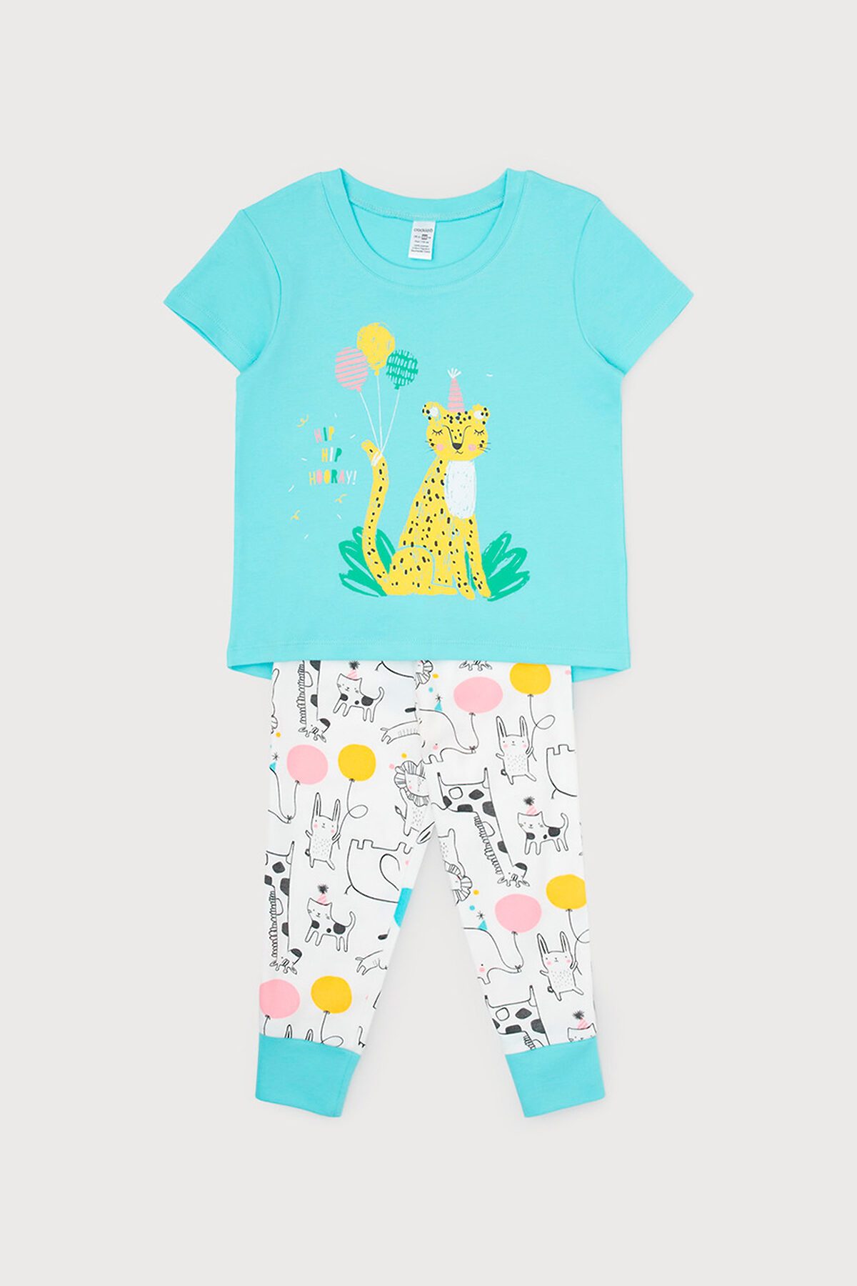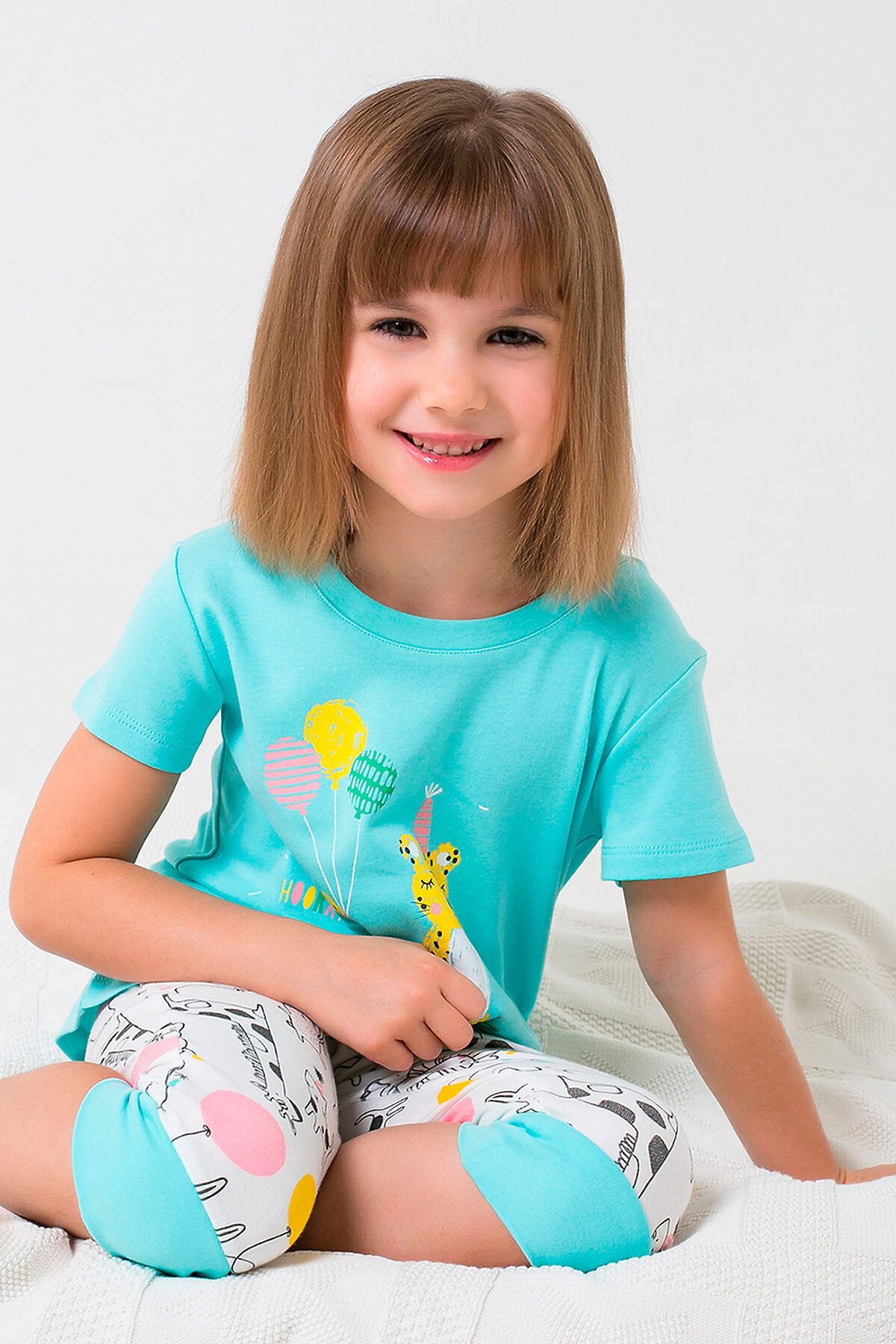 Пижама из интерлока для девочки: мятная футболка с принтом и бриджи с набивным рисунком. Короткие рукава и низ футболки обработаны плоскими швами, спинка удлинена и закруглена. Брюки с поясом на резинке оканчиваются мягкими манжетами.