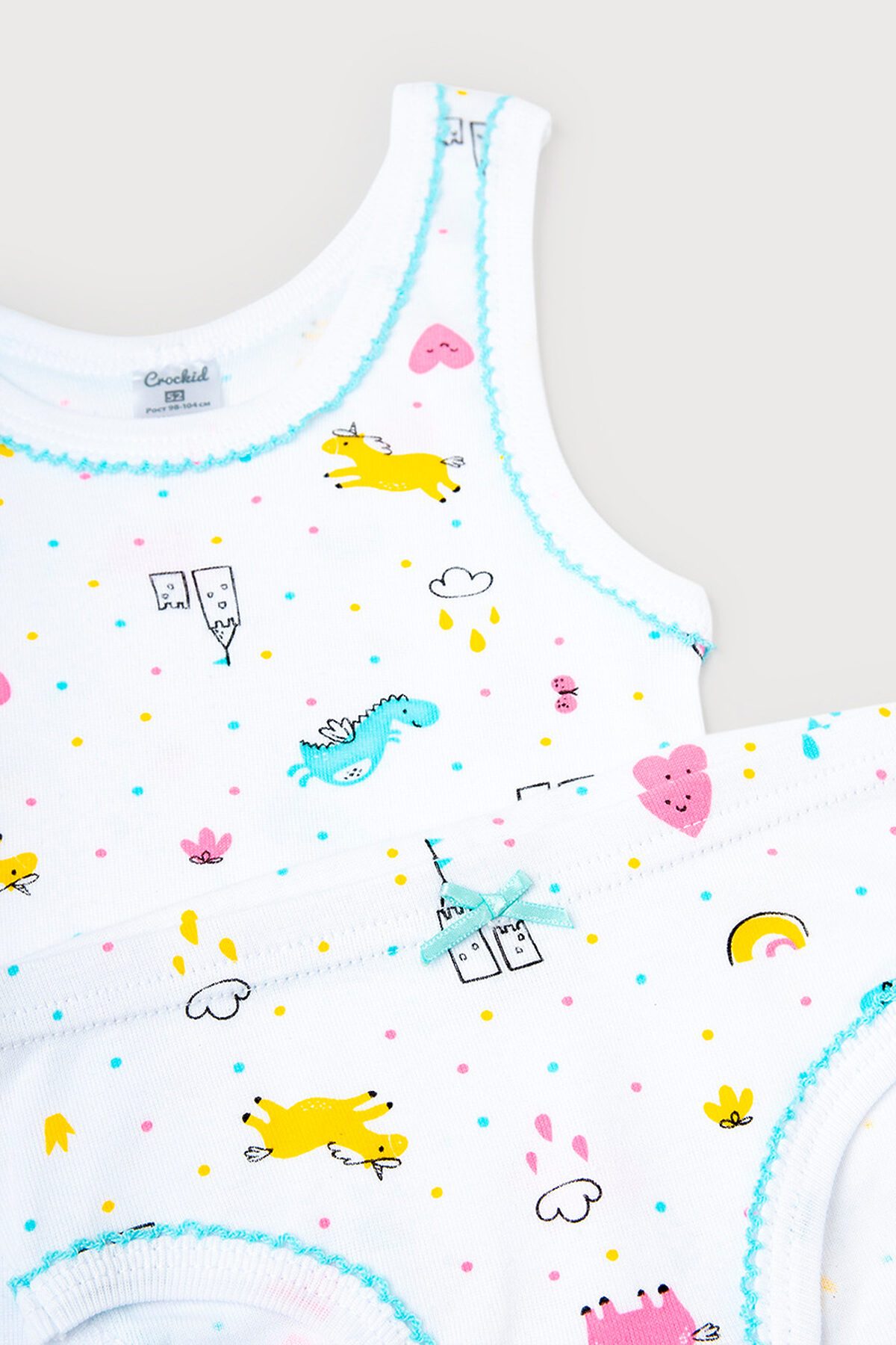 Комплект для девочки - майка на лямках и трусы из натурального хлопка. Сшит из эластичного материала рибана пенье с набивным рисунком. Горловина и проймы обработаны бейкой. Трусики украшены бантиком.