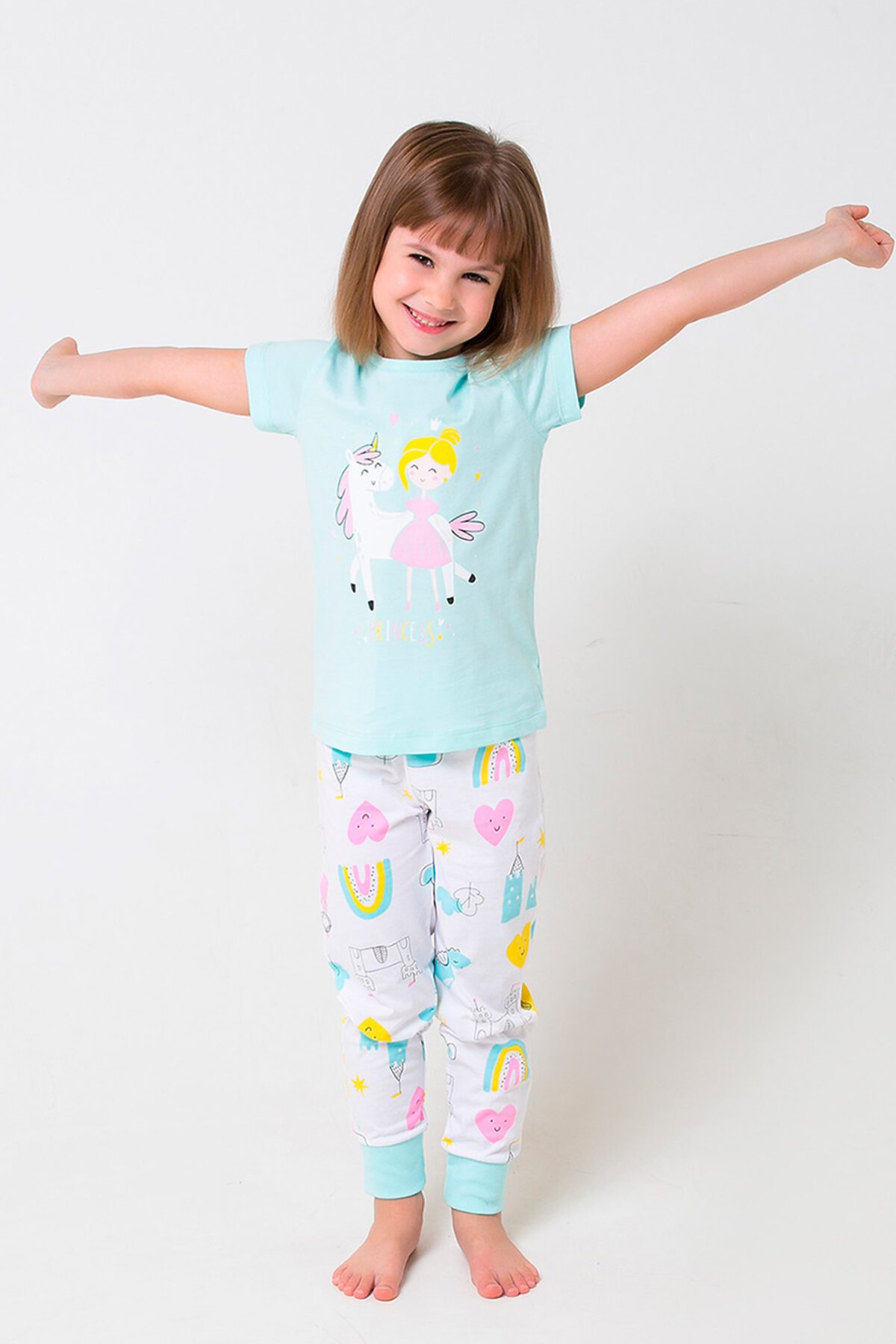 Пижама для девочки из трикотажа супрем. Однотонная футболка с принтом и брюки с набивным рисунком. Короткие рукава и низ футболки обработаны плоскими швами. В брюках эластичный пояс на резинке и широкие мягкие манжеты.