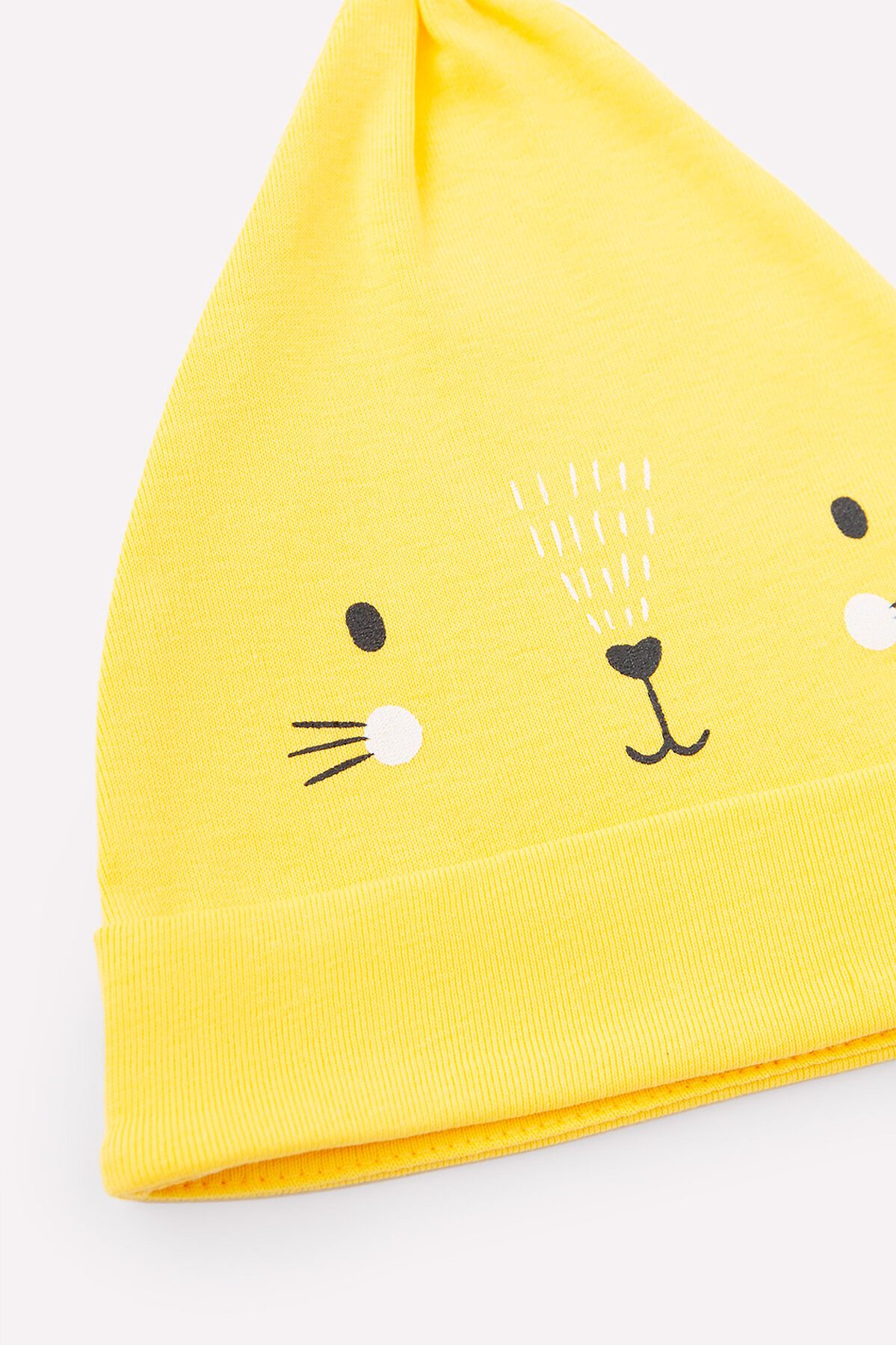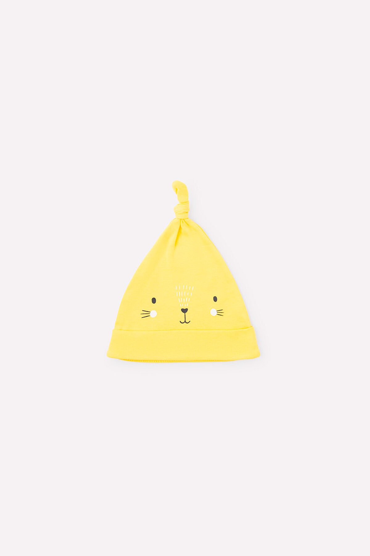 Хлопковая шапка из рибаны для девочки с принтом. На макушке украшена декоративным узелком.