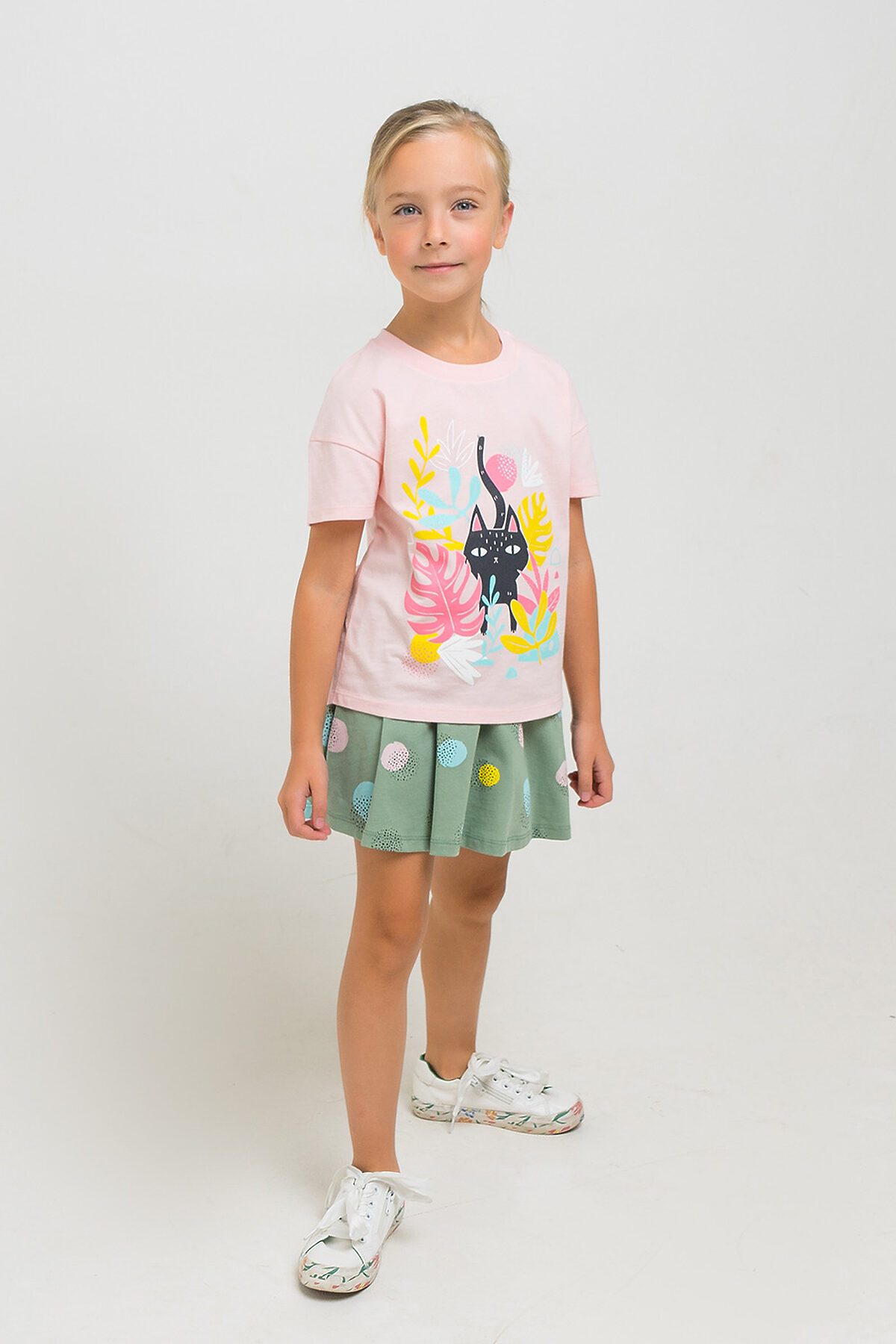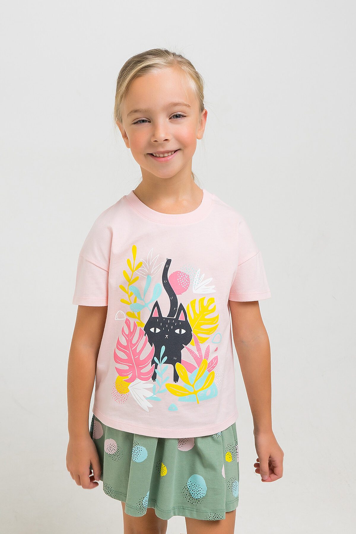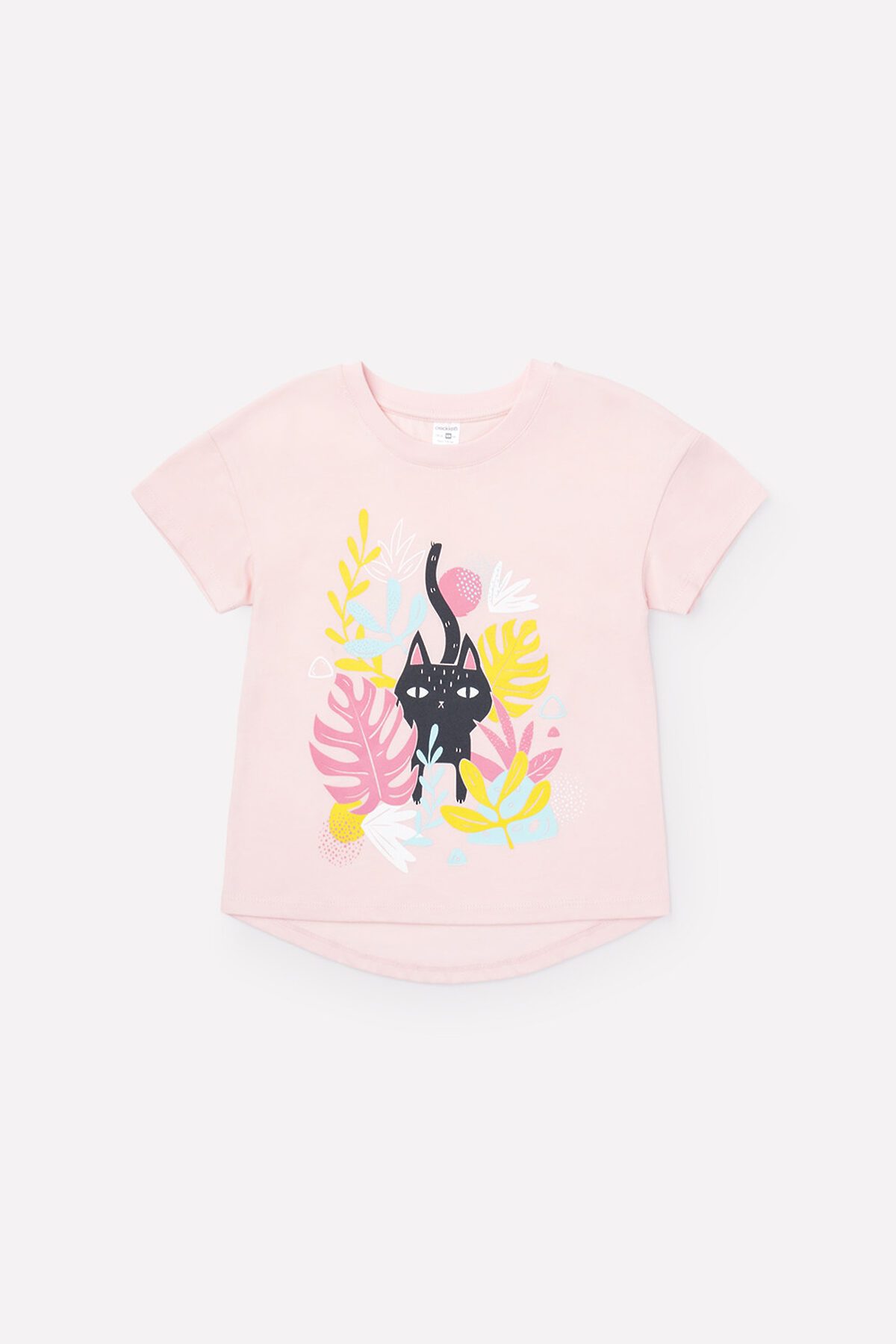 Футболка для девочки из трикотажа супрем светло-розового оттенка. Рукава слегка приспущены. Спинка удлинена и закруглена. На груди - принт с изображением котёнка в тропических листьях.