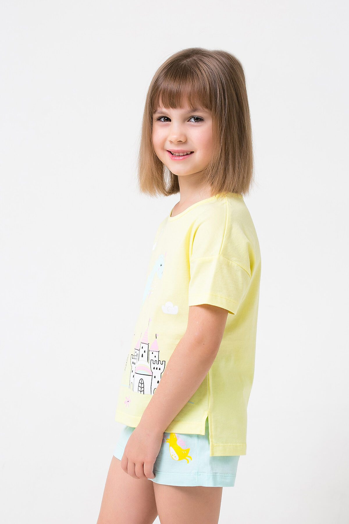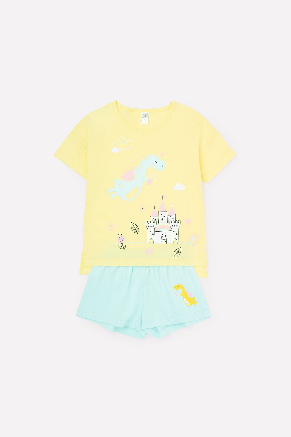 Пижама для девочки из трикотажа супрем. Однотонная футболка и шорты с принтом. Короткие рукава и низ футболки обработаны плоскими швами. Плечи спущенные, спинка удлинённая. Шорты с эластичным поясом украшены принтом в области бедра.