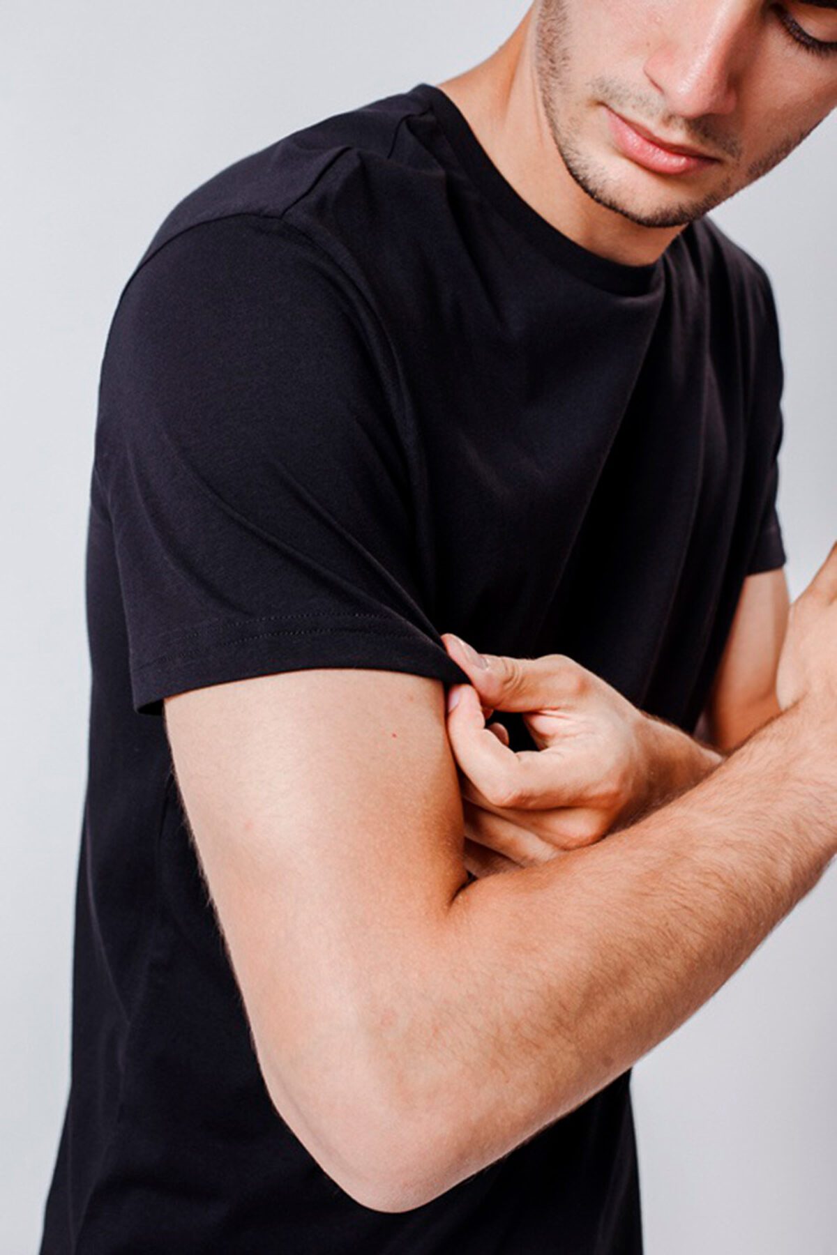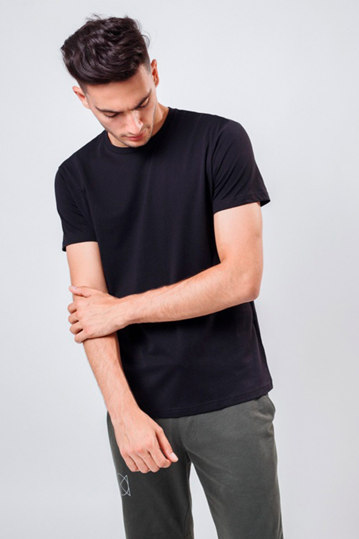 Классическая футболка прямого фасона. Укрепление по горловине спинки. Горловина рибана.