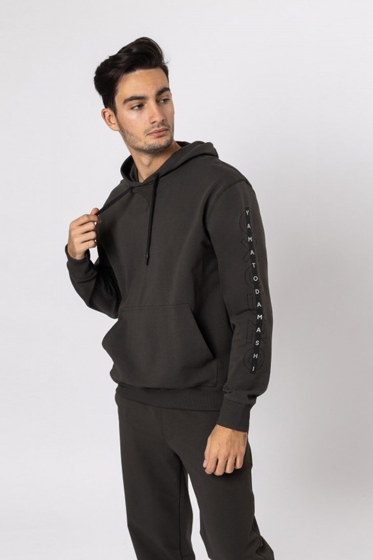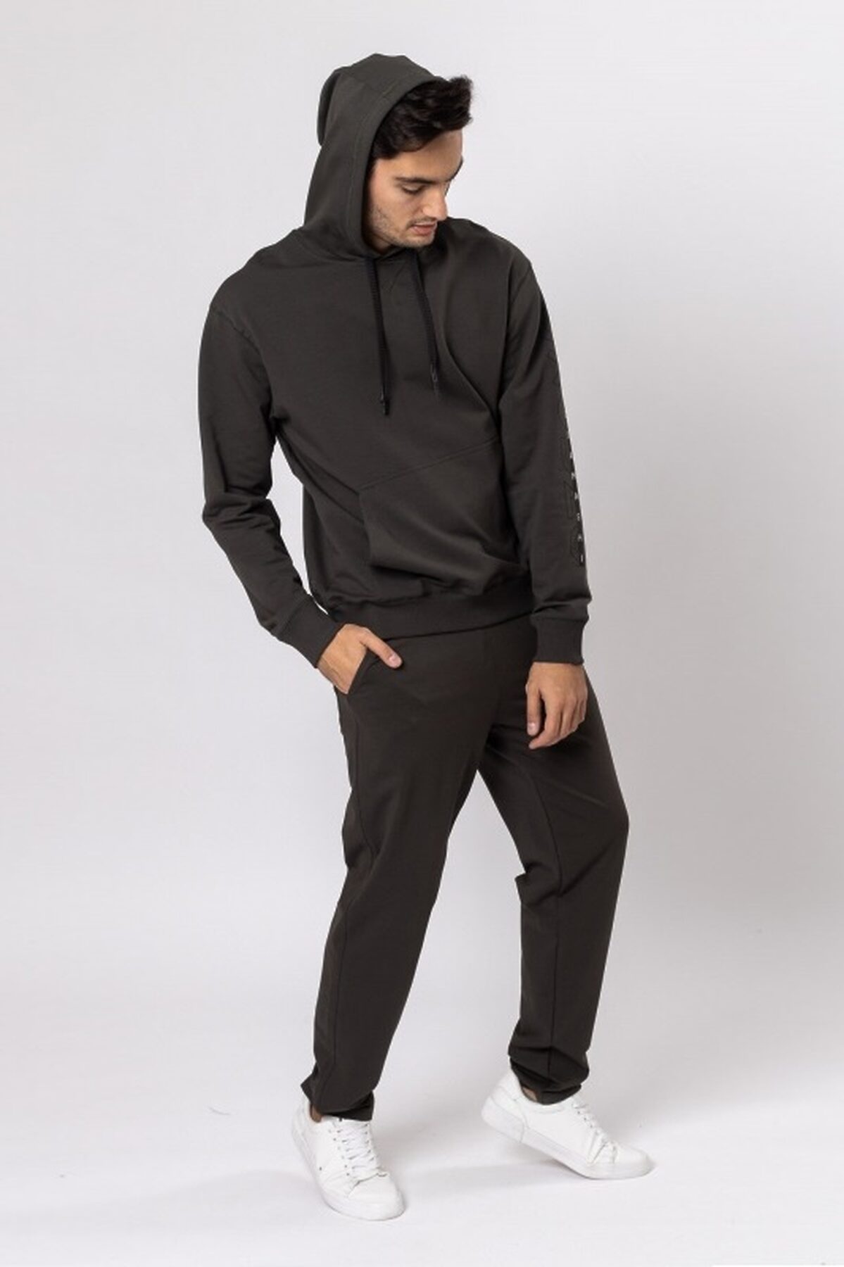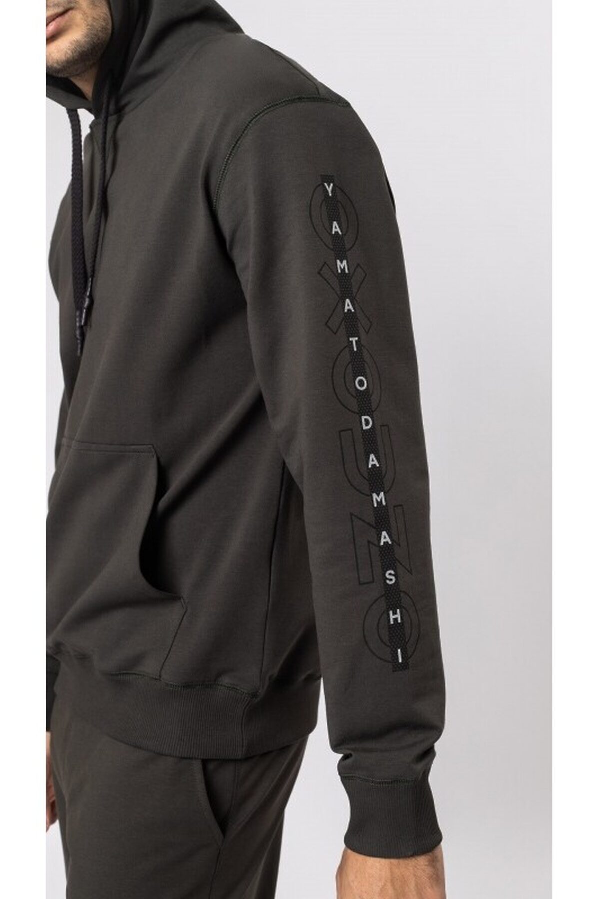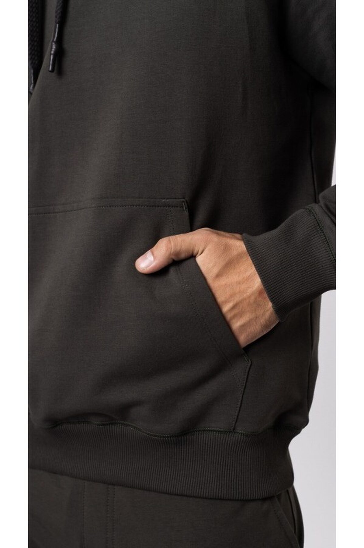 Мужской худи с капюшоном, карман кенгуру, втачной рукав, широкий пояс и манжеты из кашкорсе, декор отстроченный треугольник из кашкорсе.