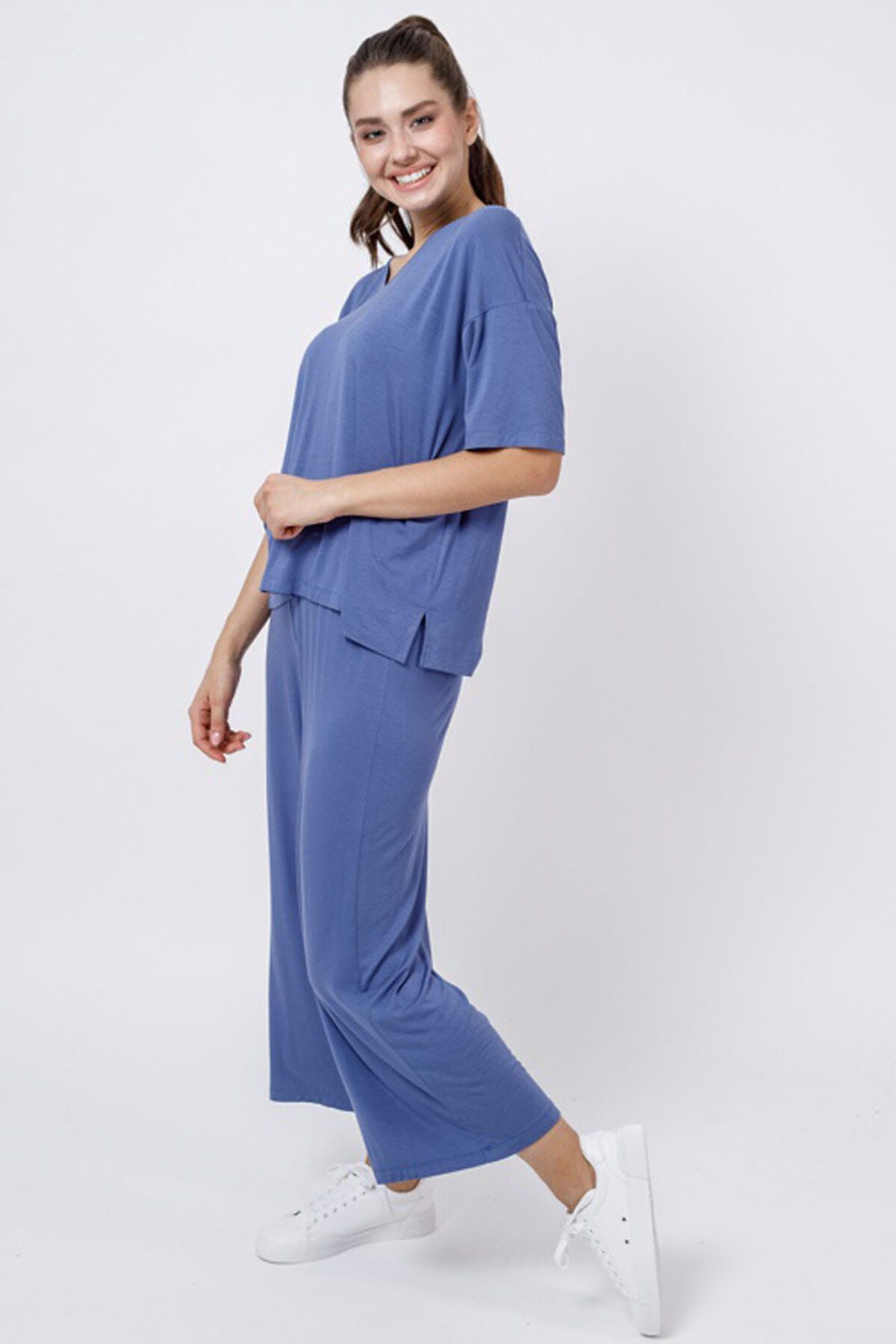 Футболка свободного кроя, спущенное плечо, короткий рукав, в боковых швах обработаны разрезы. V-вырез. Брюки свободного кроя, длина семь восьмых